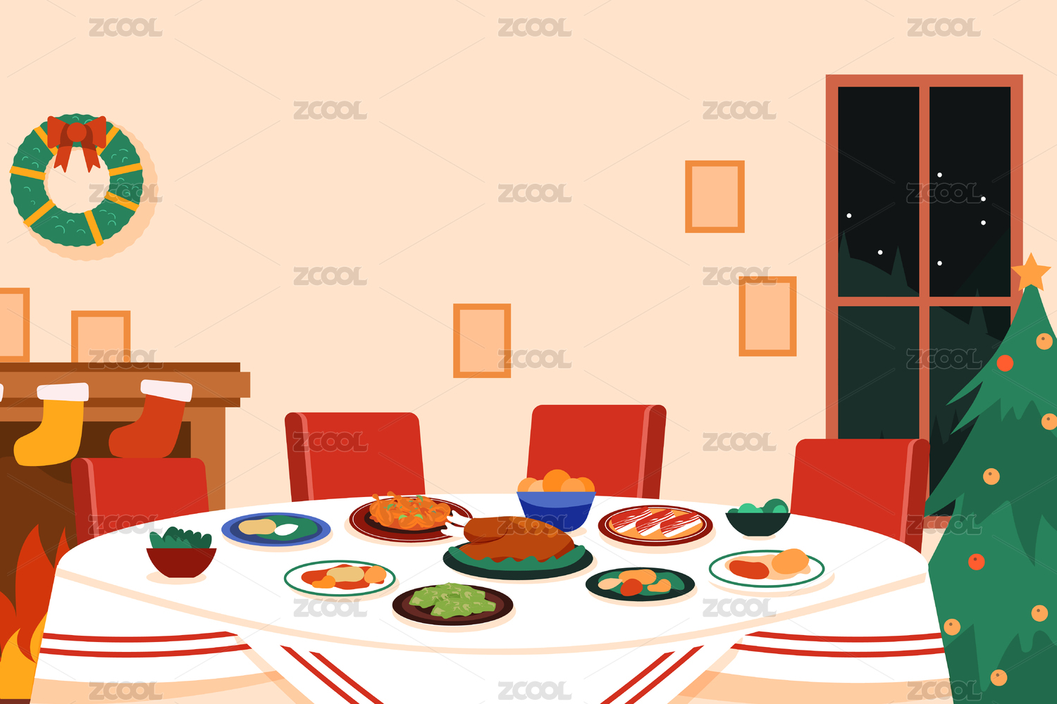 圣诞,冬日,美食,盛宴,披萨,烤鸡,红酒,插画,扁平,西式