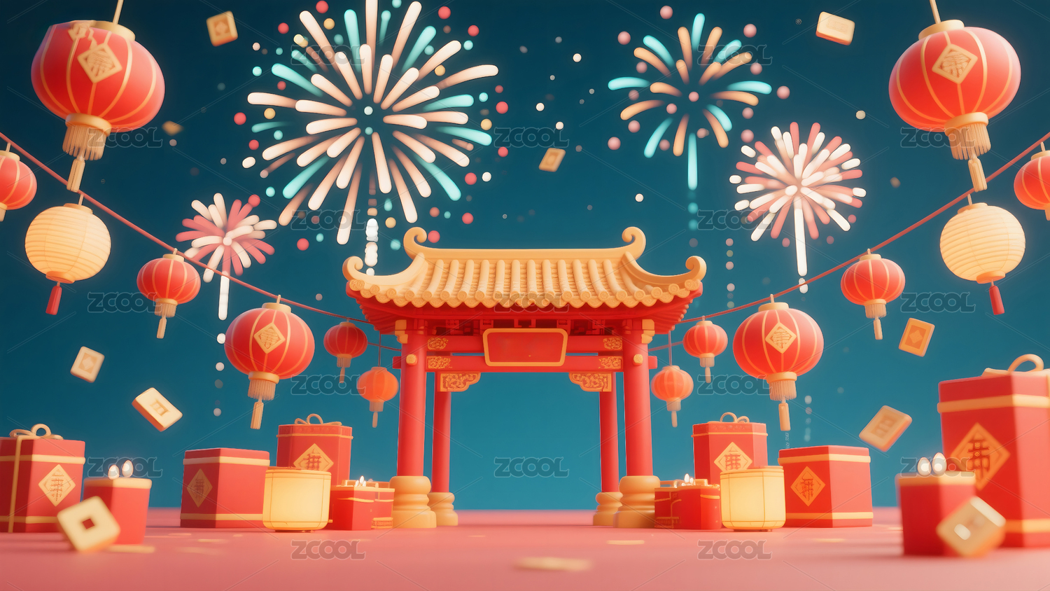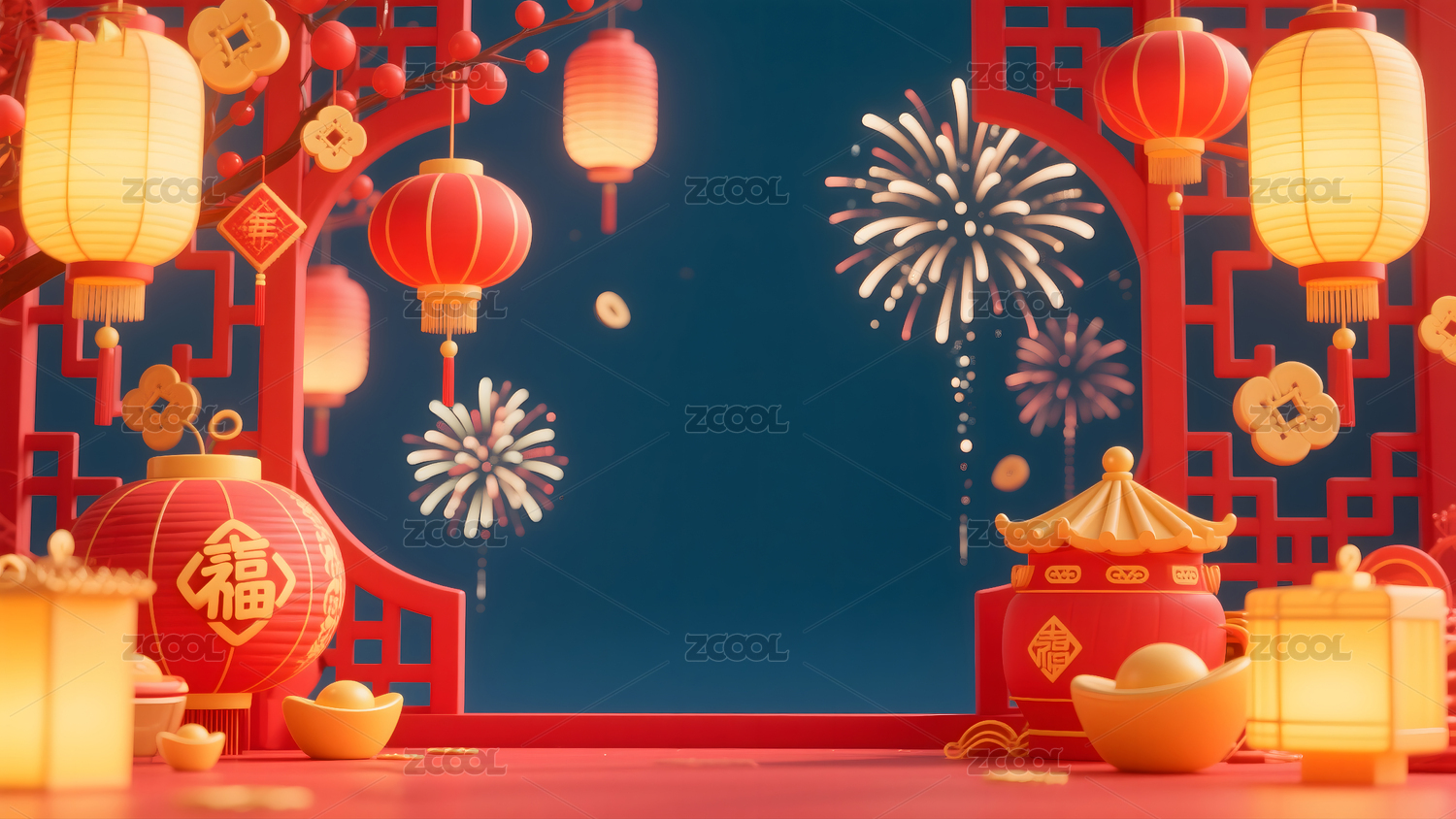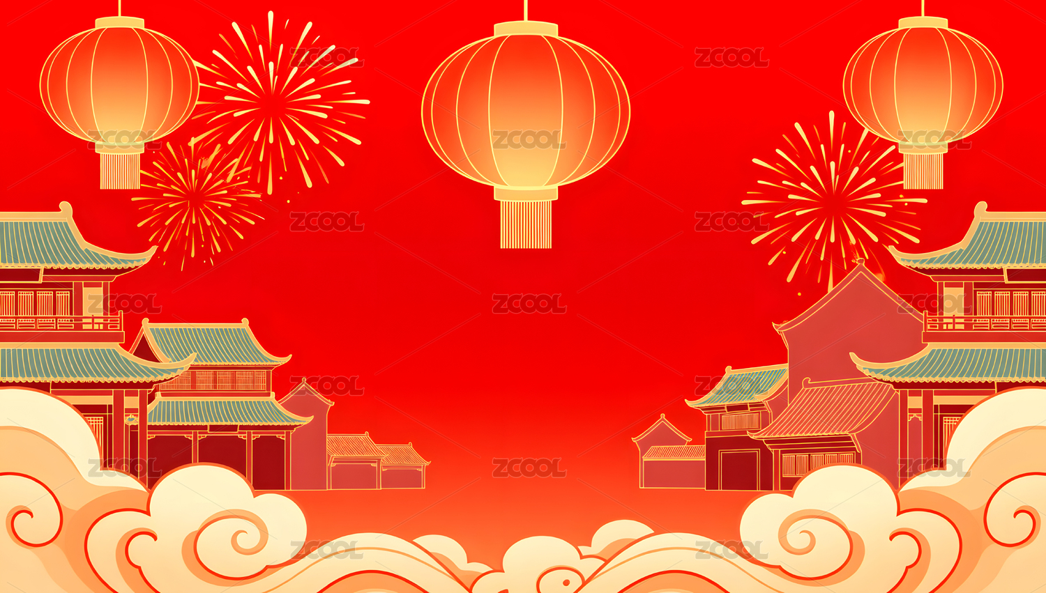新年喜庆灯笼祥云烟花爆竹大气红色海报背景