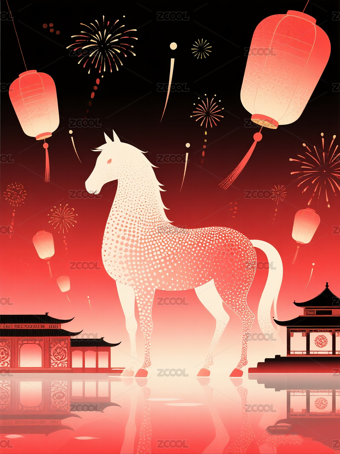 传统佳节夜景中马的侧影映照灯笼