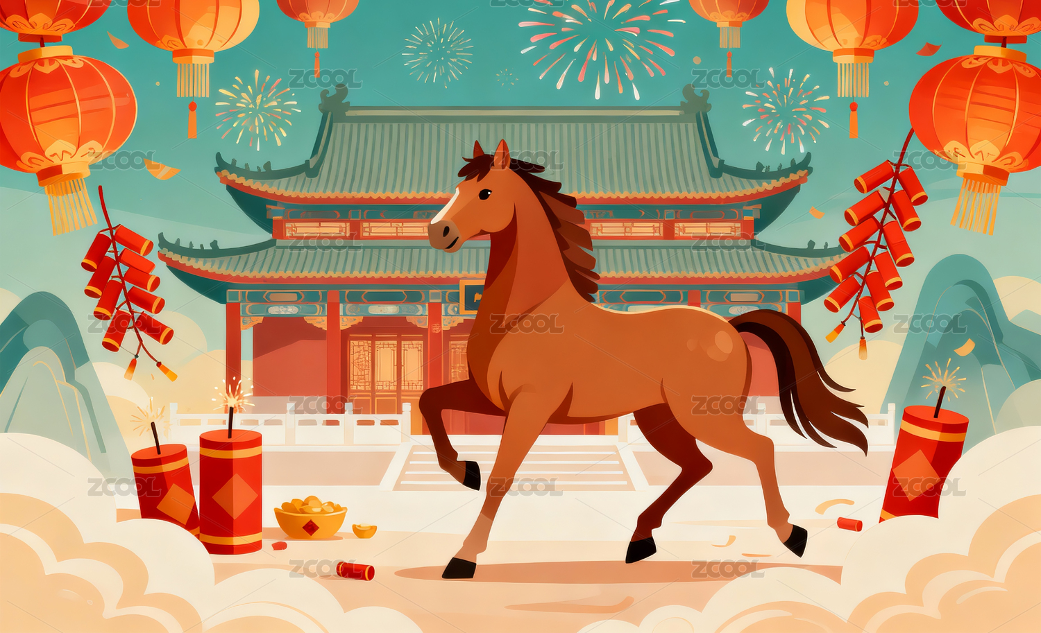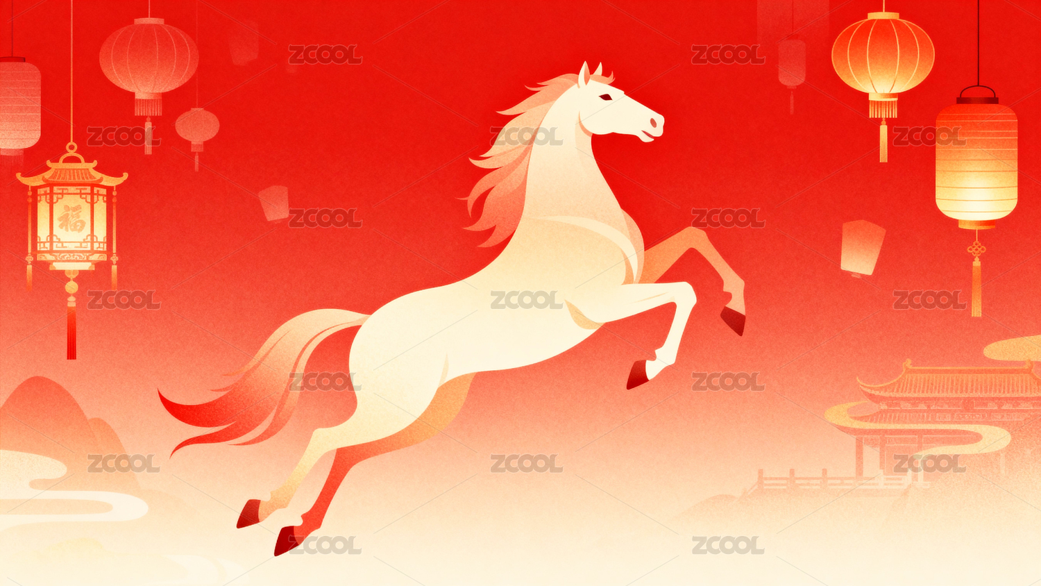 奔马在青绿山峦与灯笼祥云中展现清新国潮气