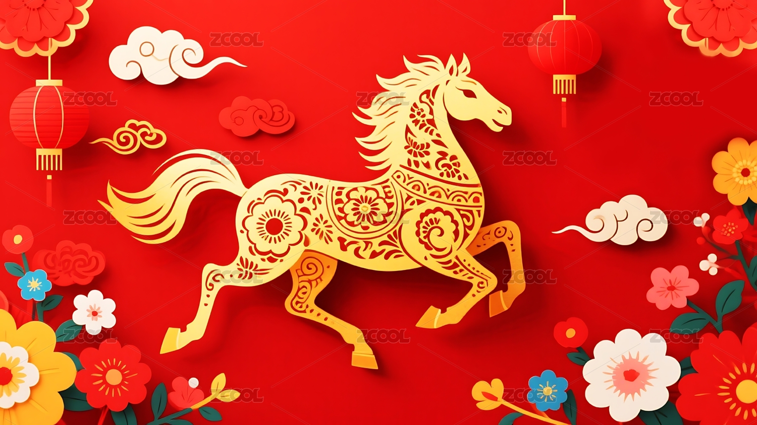 马,剪纸,红色,云,背景,传统,装饰,图案,文化,花纹
