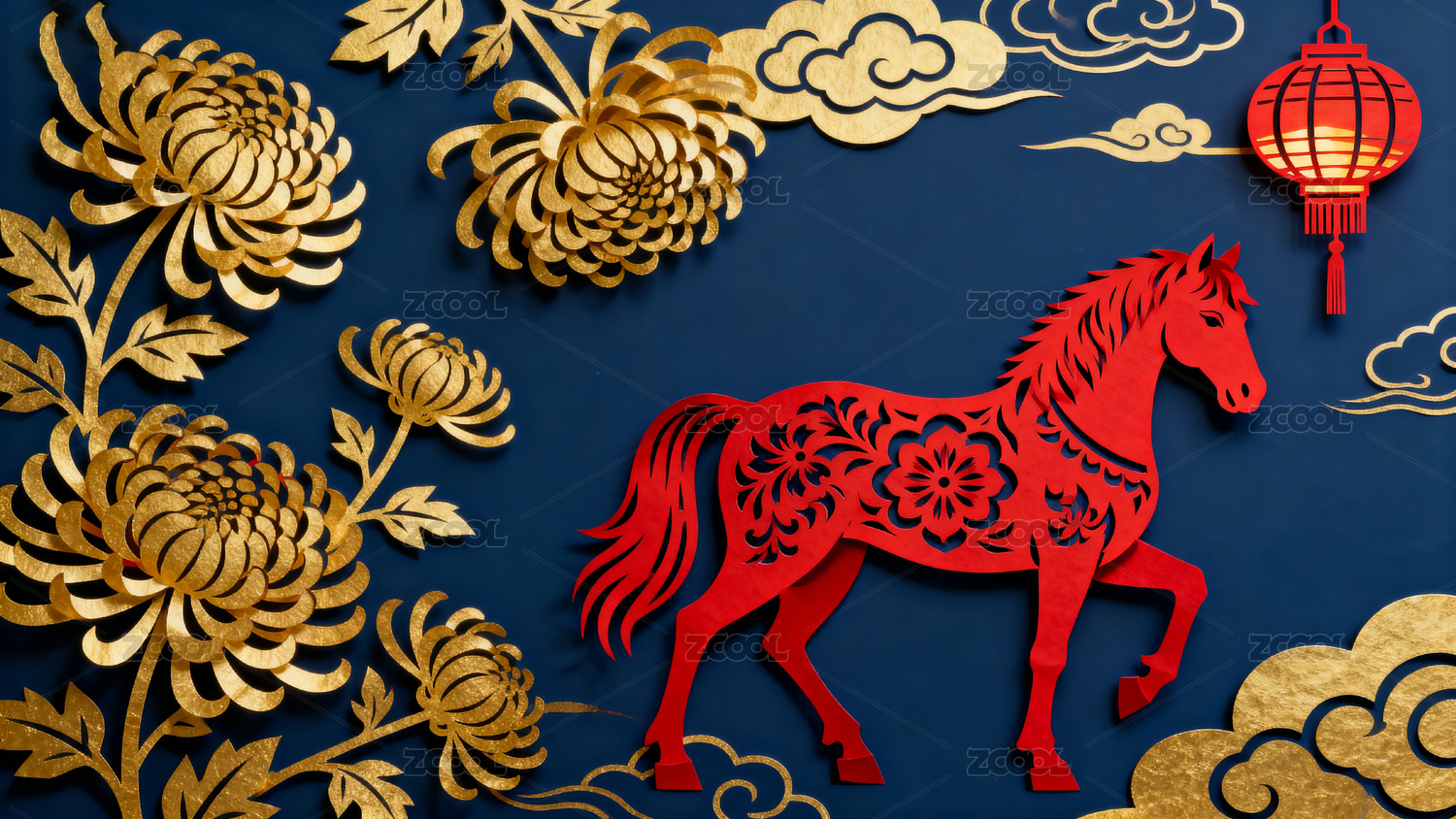 红色剪纸马配金色菊花与云纹装饰