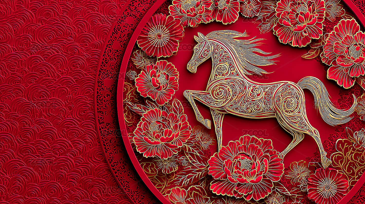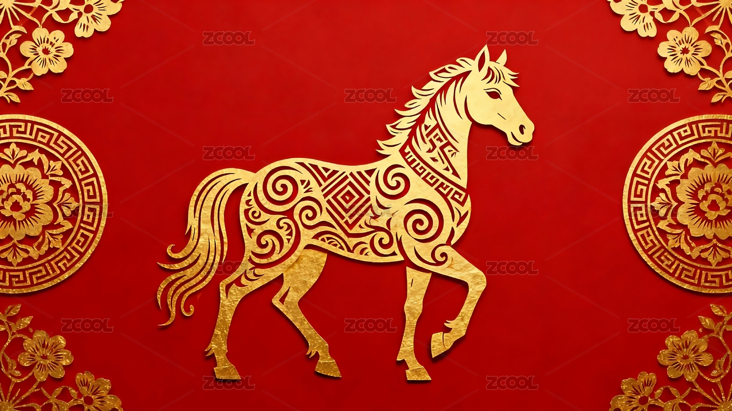 金色骏马剪纸配祥云红底图案