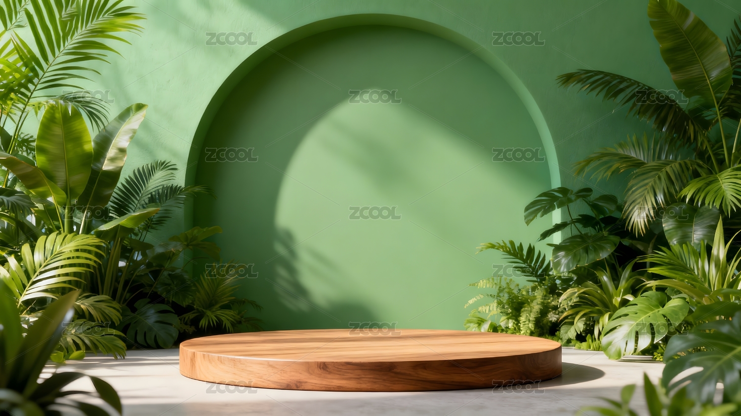 绿色背景下的木质展台与热带植物