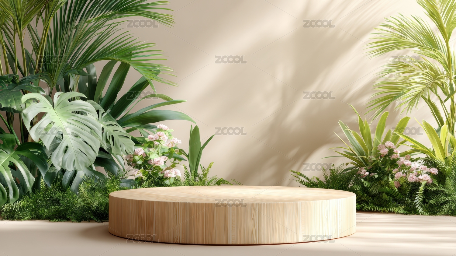 热带植物与圆形木台背景