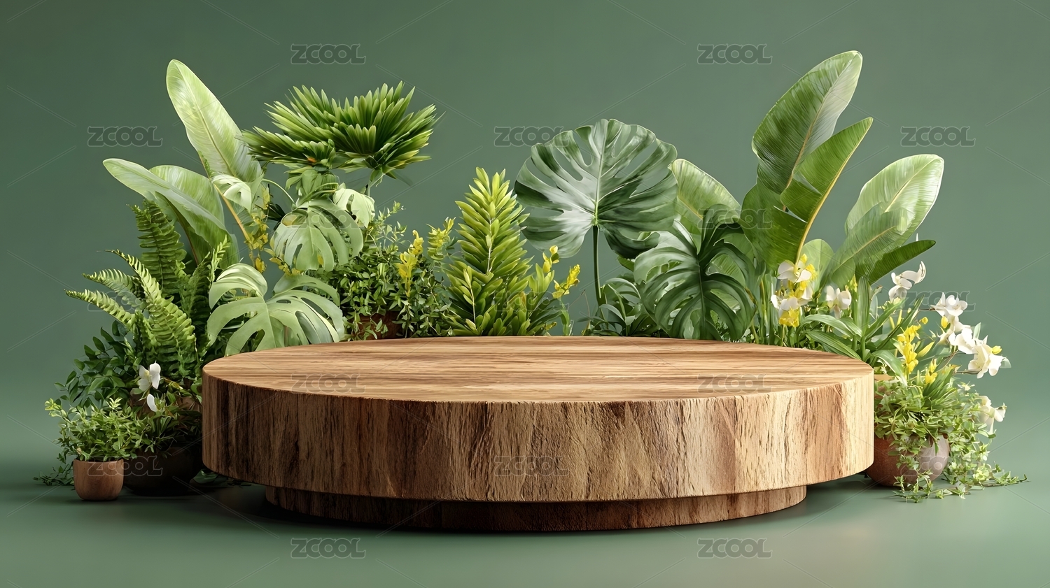 绿色植物环绕木质圆台背景