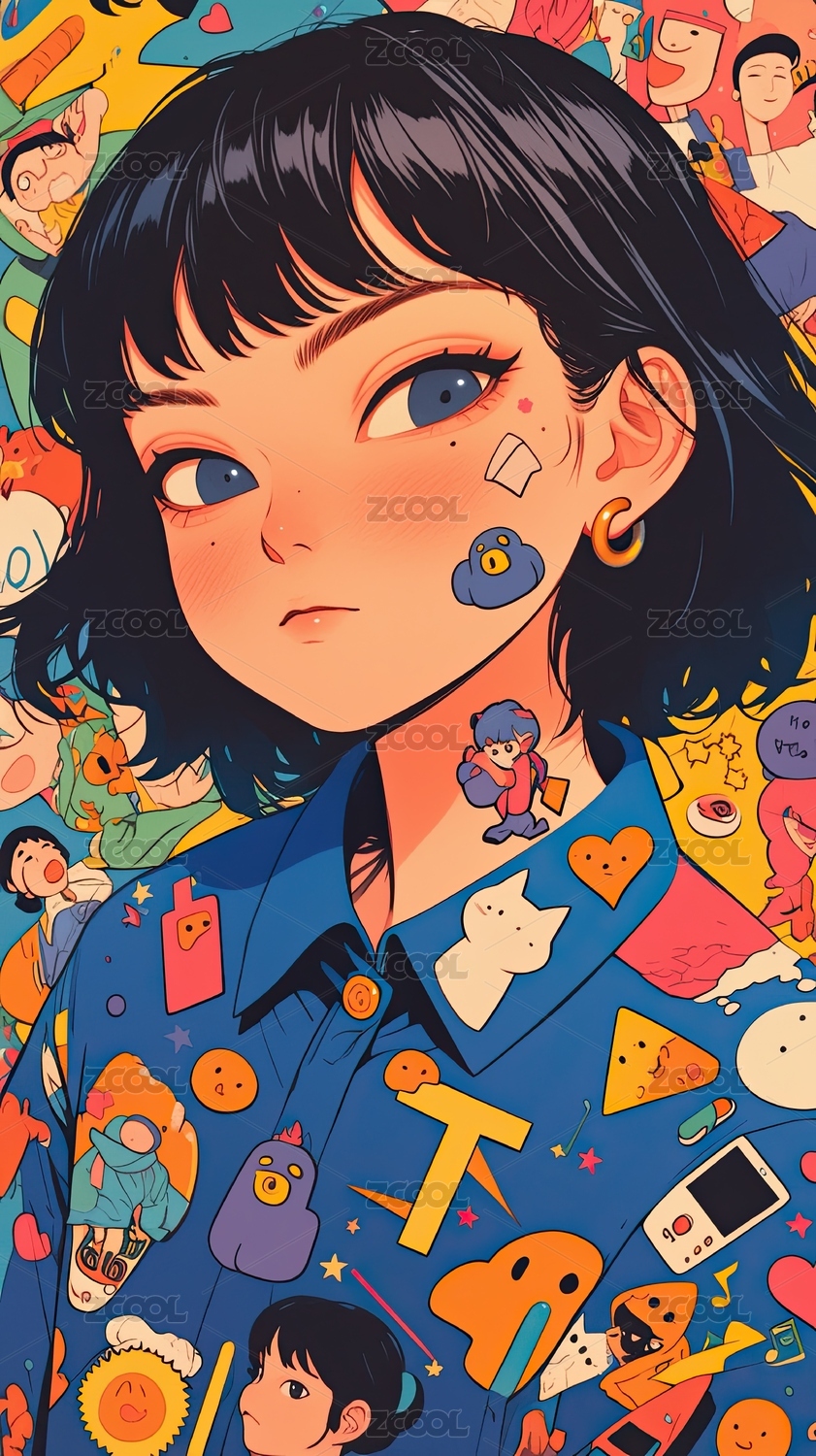 卡通风格的少女与多彩图案背景