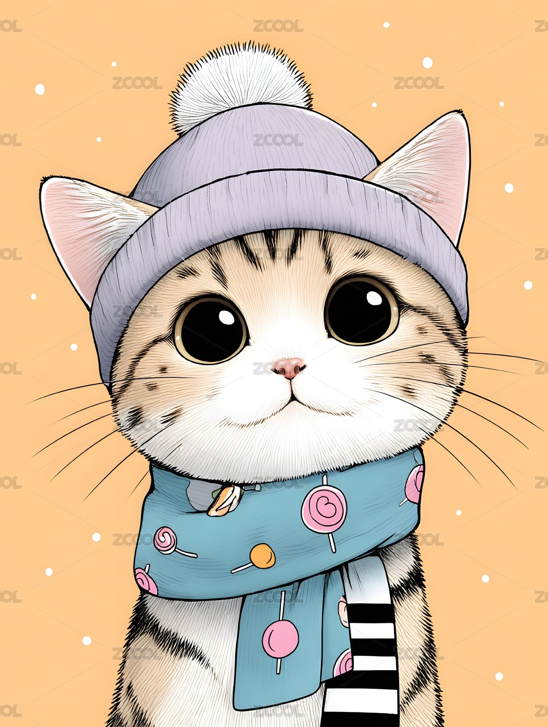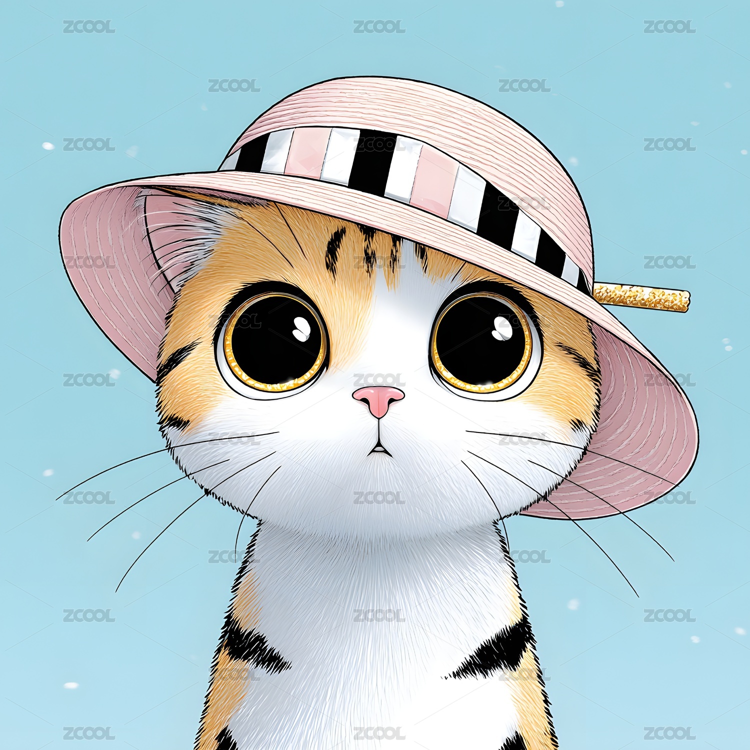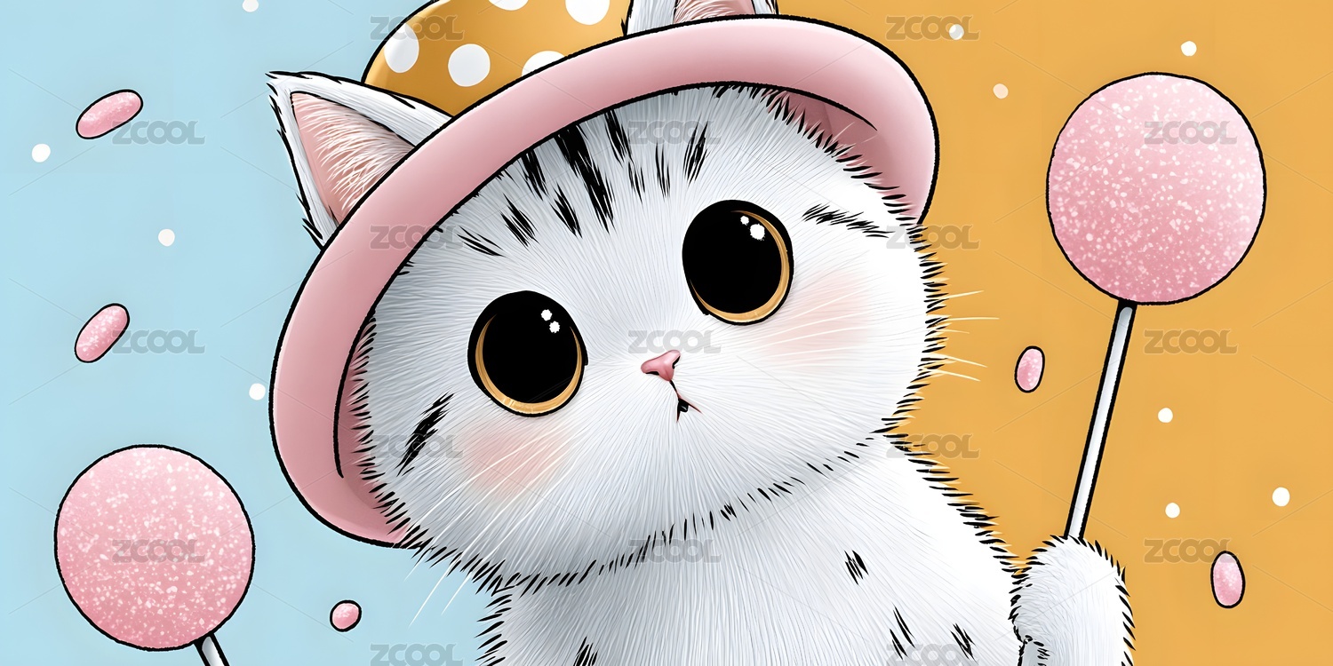 蓝色,背景,艺术,平面,插画,猫咪,帽子,头饰,粉色,糖果