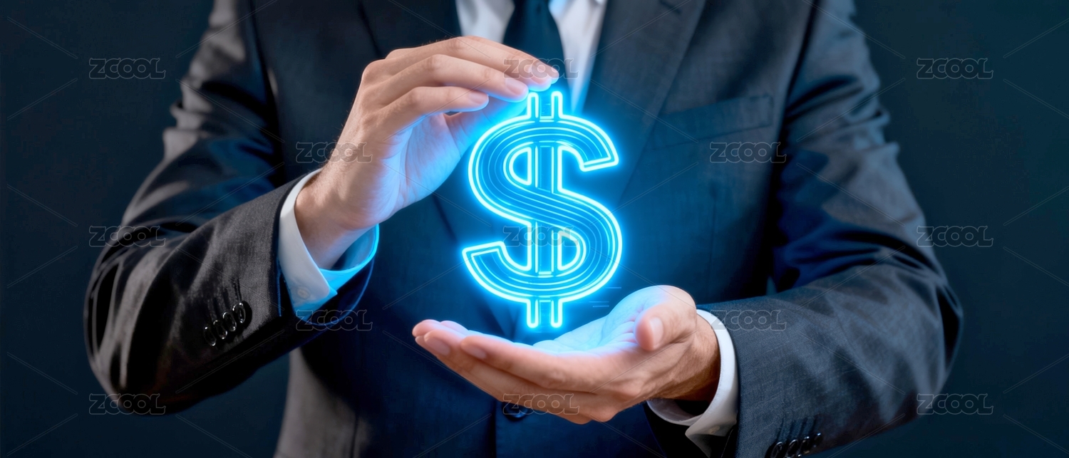 一个商务人士手指着金钱美元符号虚拟数字货币区块链投资理财概念