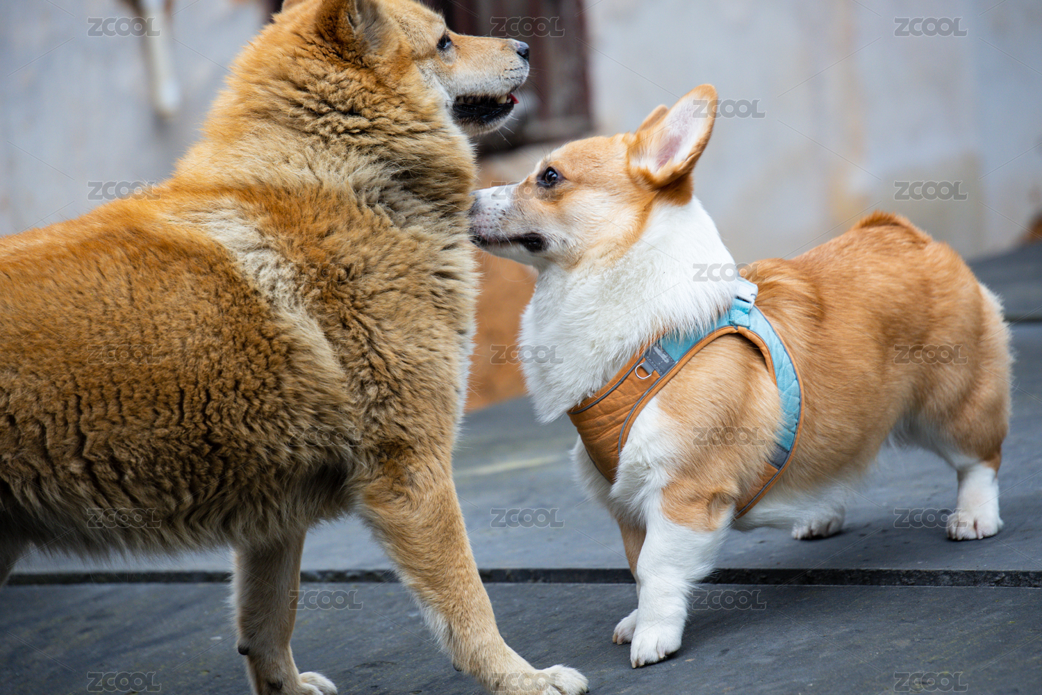 农村庭院里,一大一小两只狗正在嬉戏玩耍