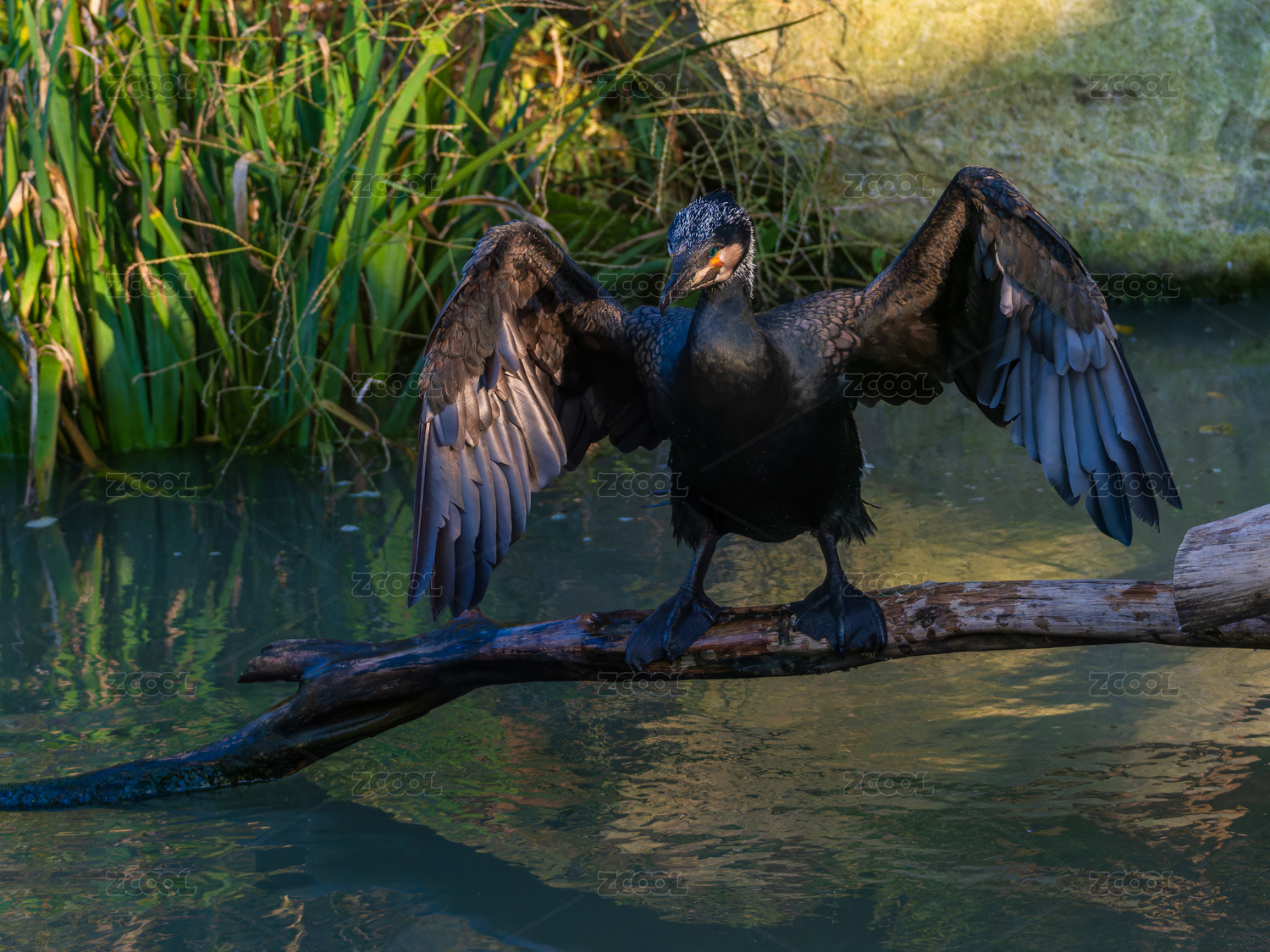 鸬鹚,水鸟,鸟类,羽毛,喙,眼睛,爪子,树枝,水面,倒影