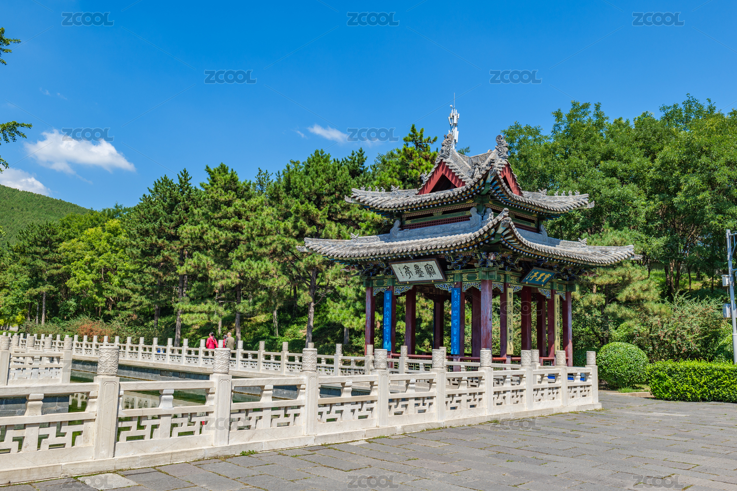 吉林市炮台山上蓝天白云下的琉璃瓦凉亭