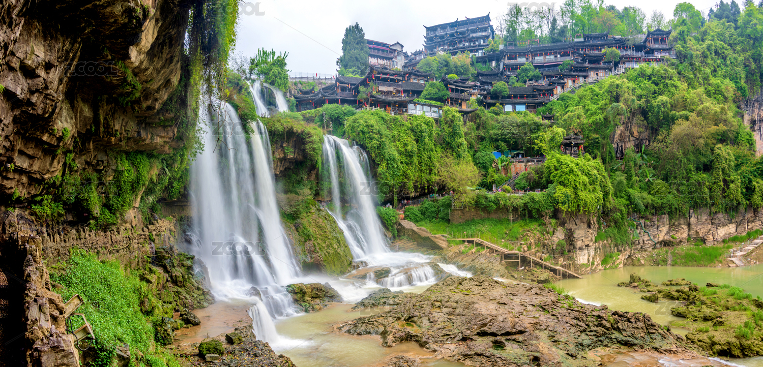 湖南湘西永顺县芙蓉古镇飞流直下的瀑布