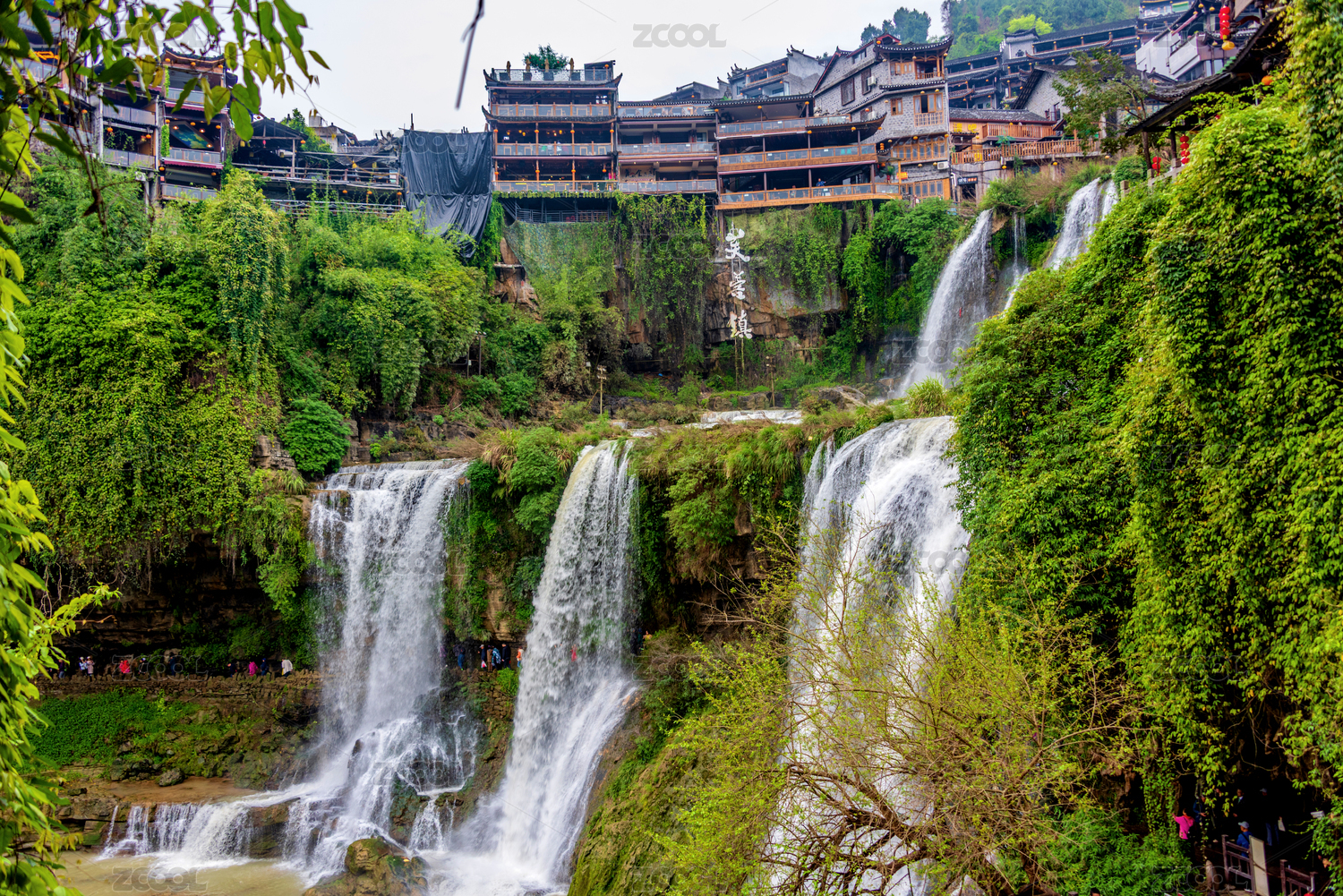 湖南湘西永顺县凤凰古镇飞流直下的瀑布