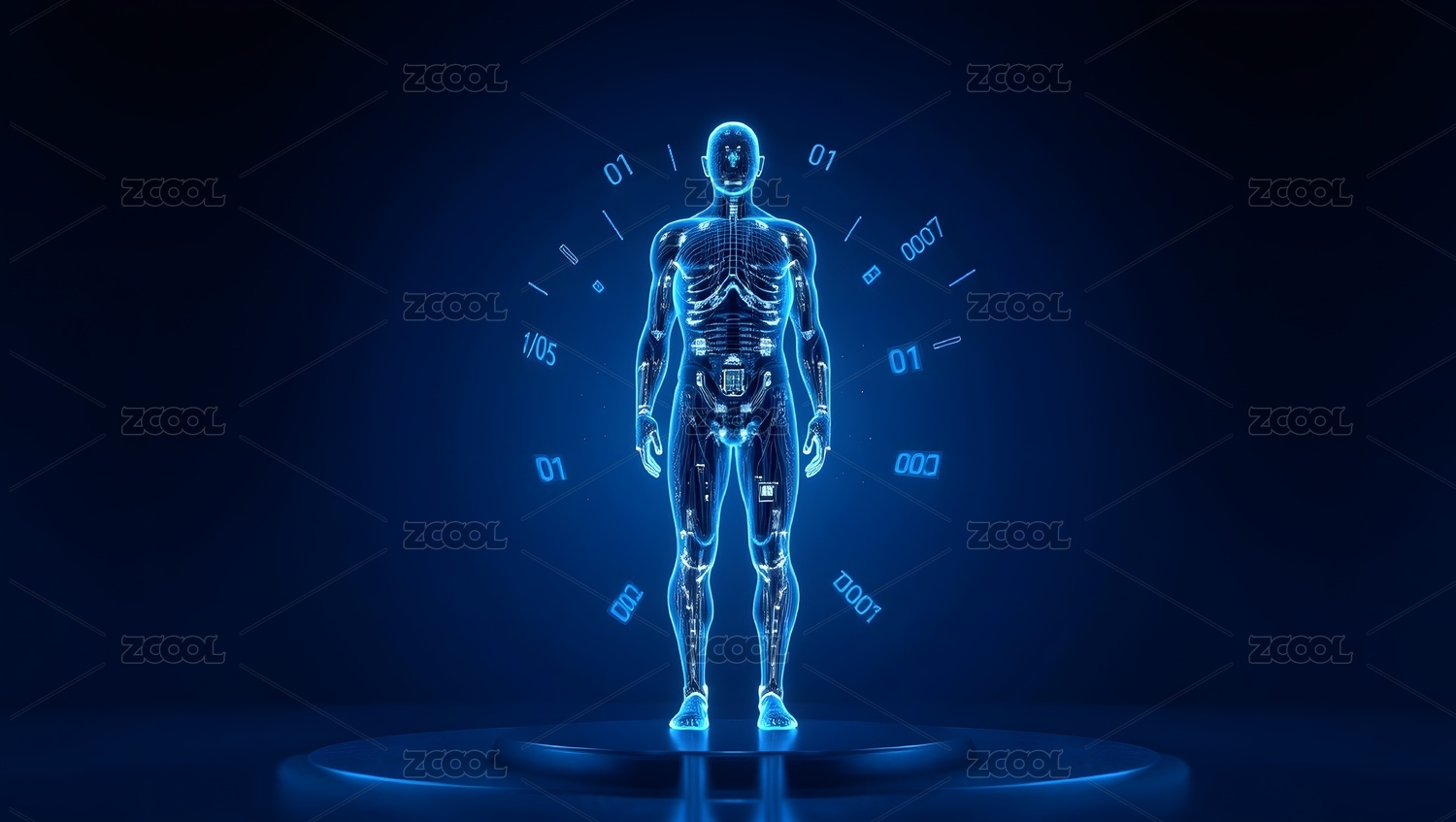 科技感,蓝色背景,人体扫描,科技未来,数字人体,未来科技,数据网络,光环特效,人体模型,网格线条