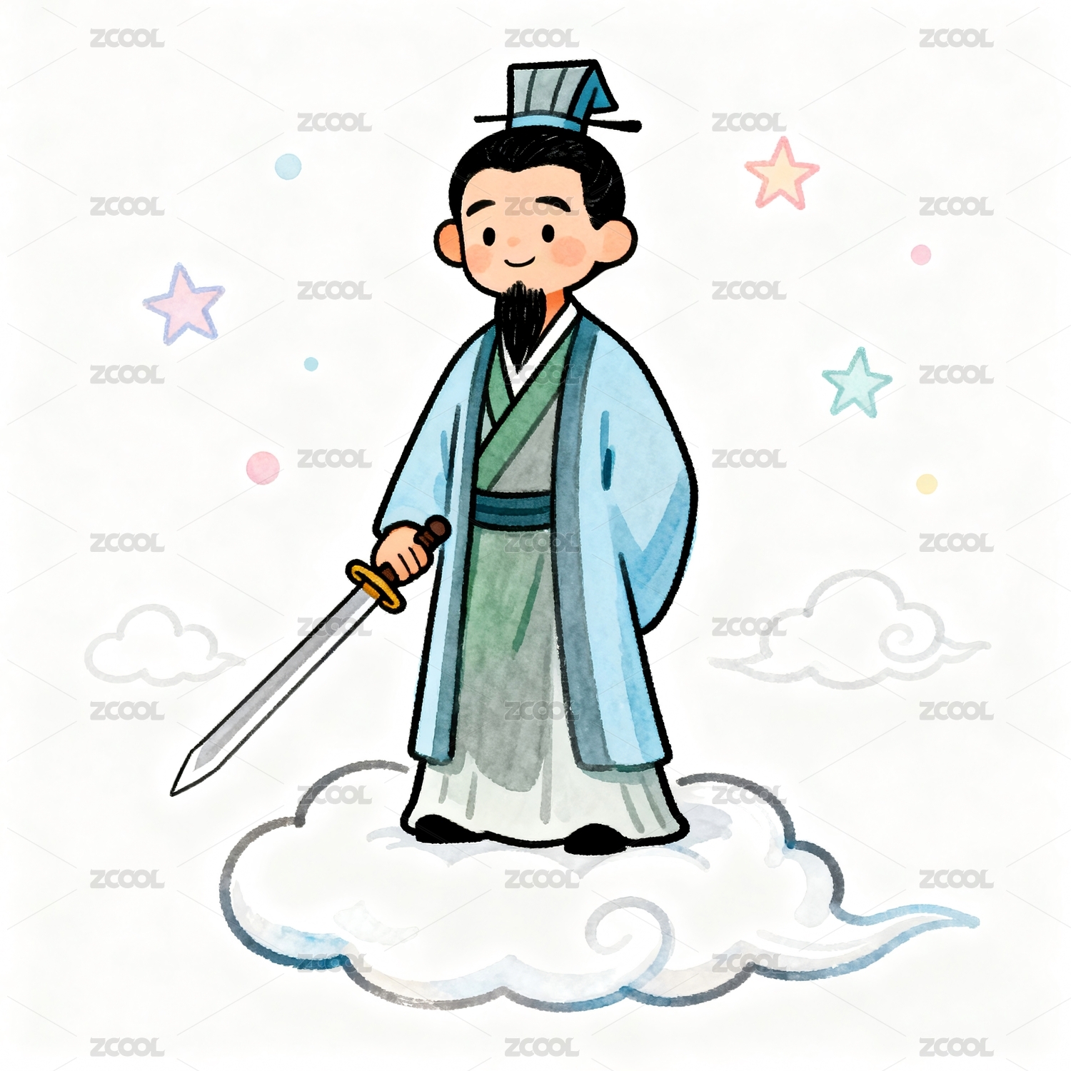 持剑古代人物站在云上