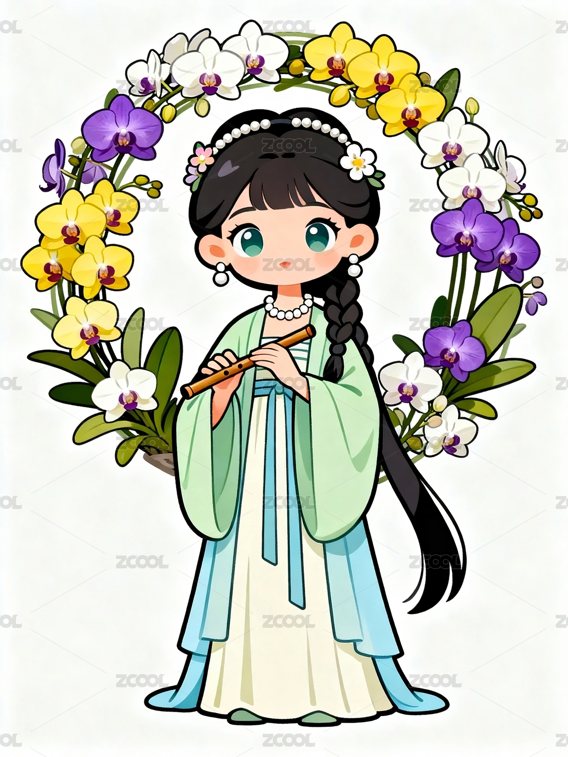 花环,眼睛,黄色,绿色,站立,长发,微笑,花朵,人物,服饰