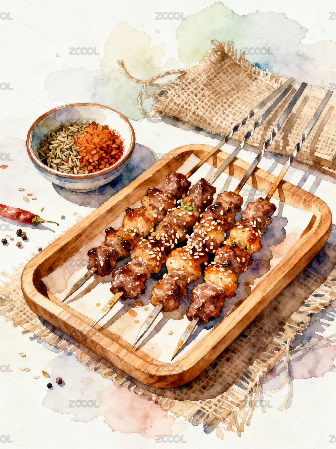 暗背景砧板水上多串放一起的烤肉羊肉串