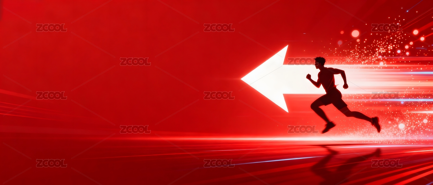 红色背景中奔跑的人影与光箭头