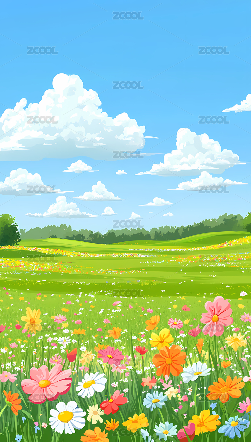 春天鲜花草地蓝天白云田园风光清新卡通背景