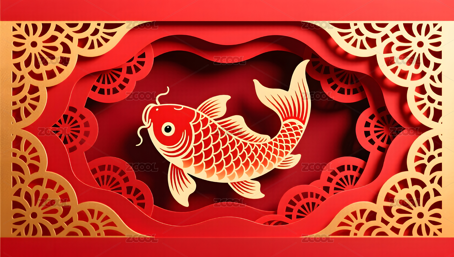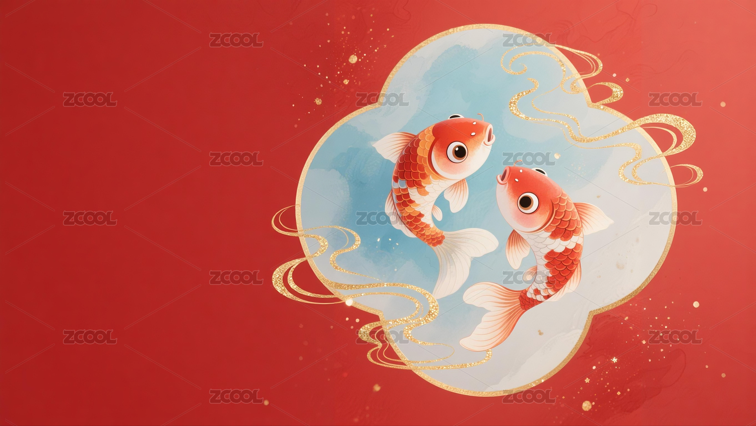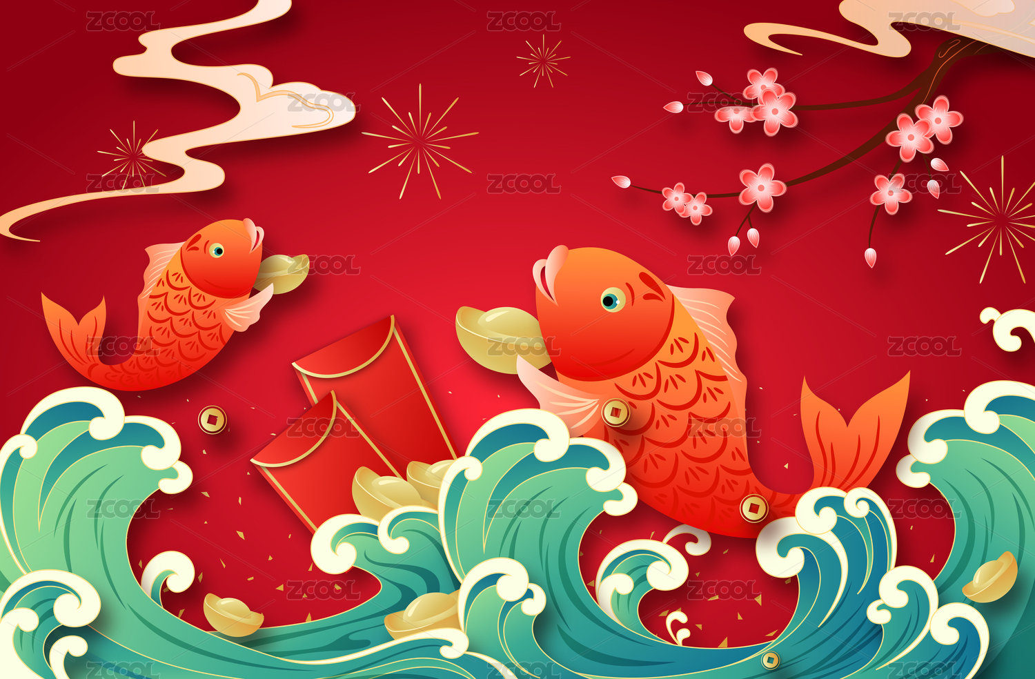 春节,插画,除夕,新年,鲤鱼,鱼类,红色,中国文化,锦鲤,运气