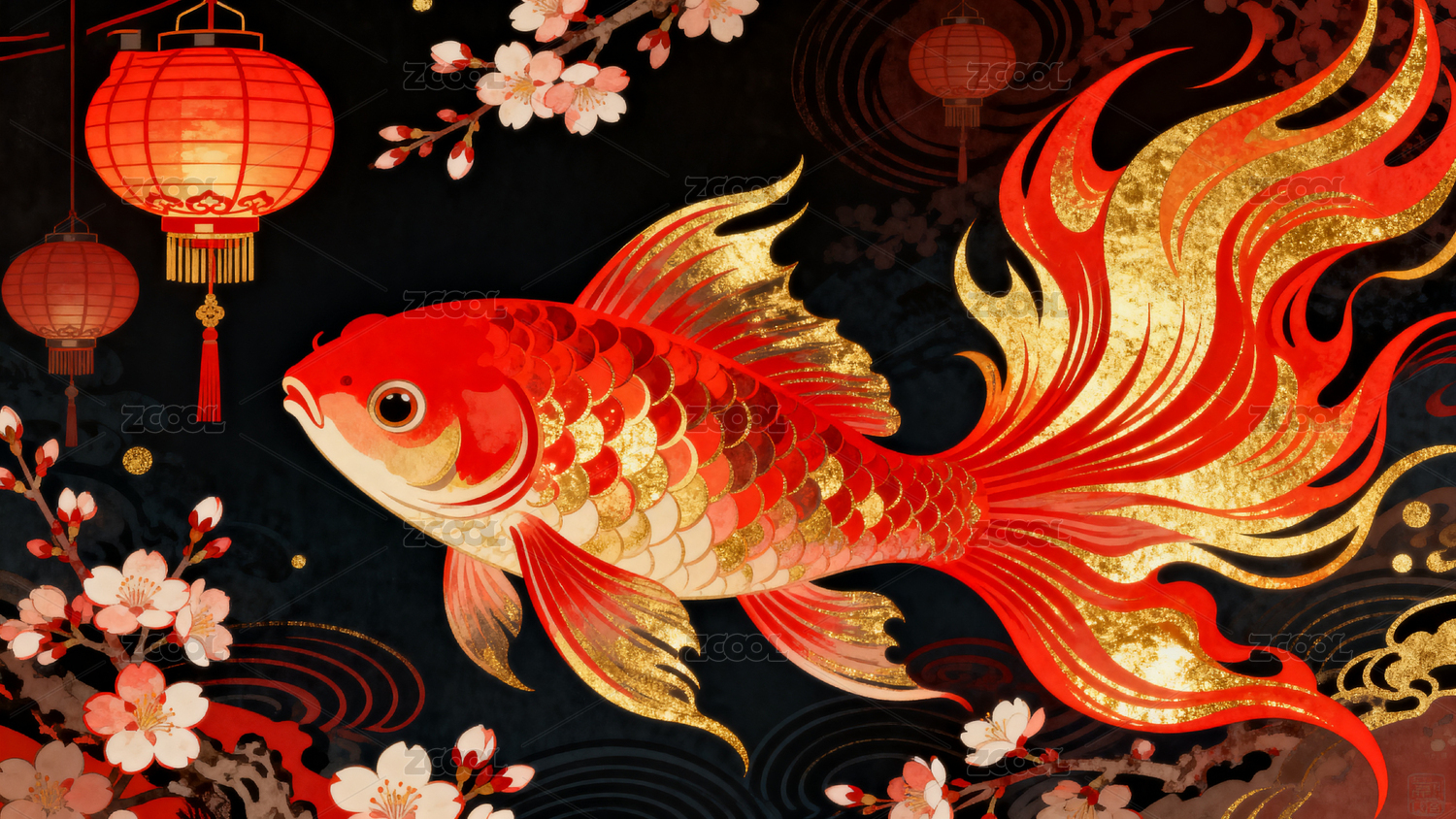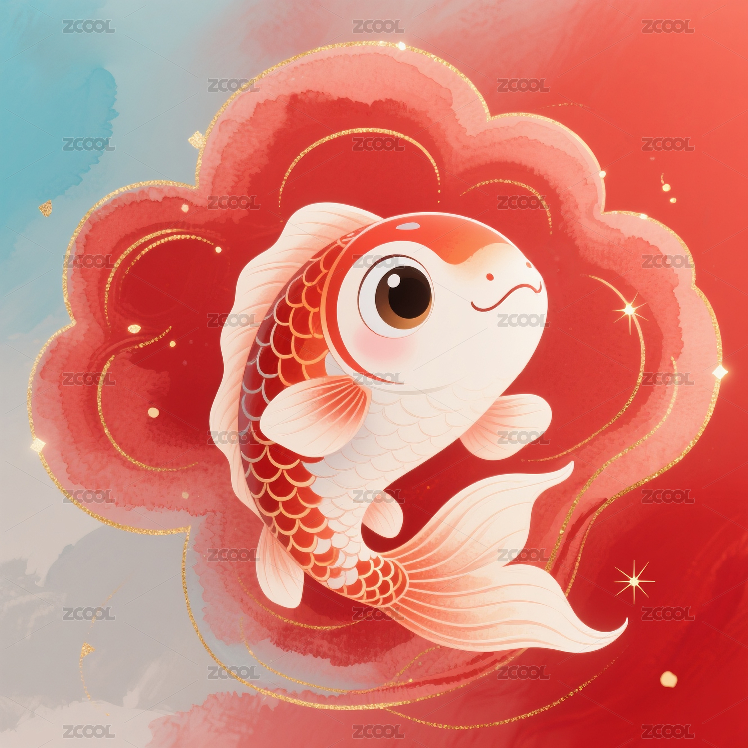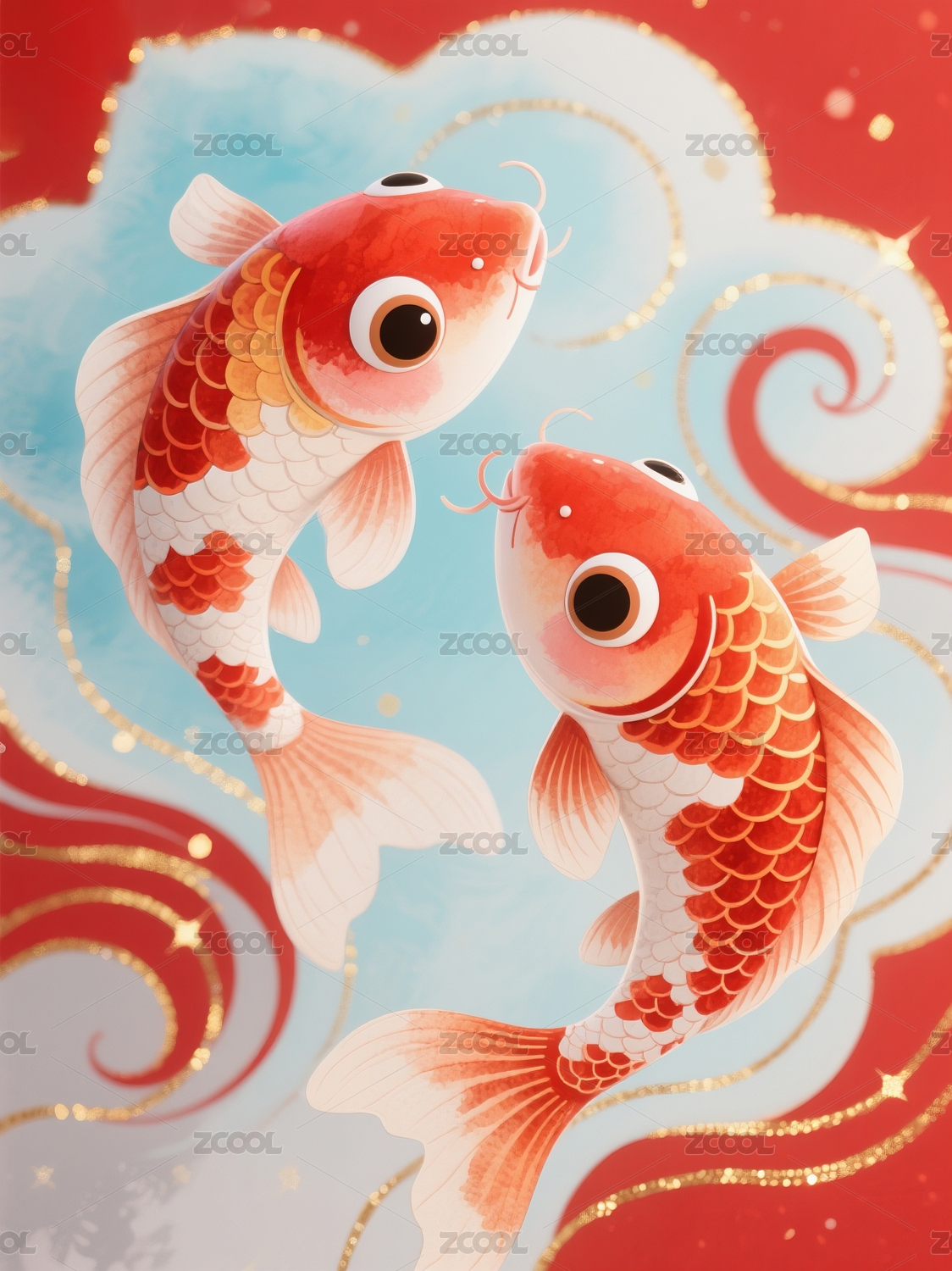 春节,插画,除夕,新年,鲤鱼,鱼类,红色,中国文化,锦鲤,运气