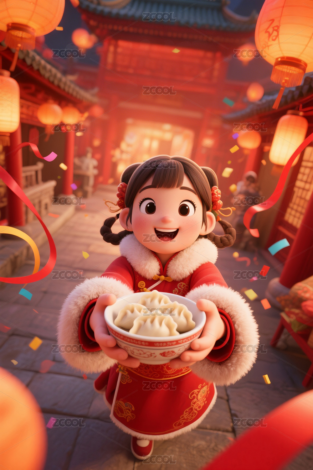 3d卡通插画手捧饺子的红衣女孩庆团圆