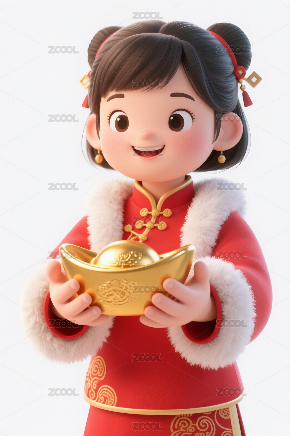 3d卡通插画手捧金元宝的红衣女孩贺新春