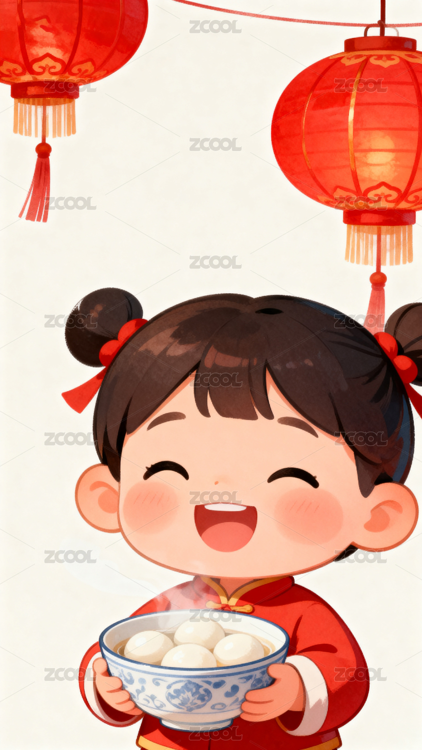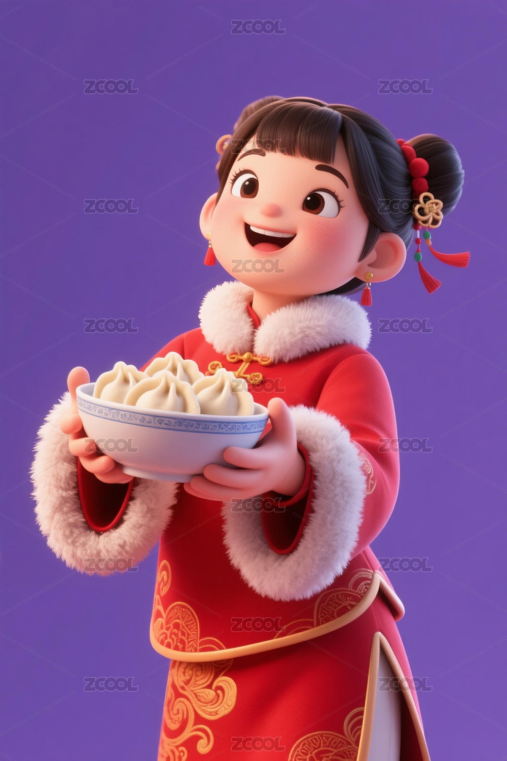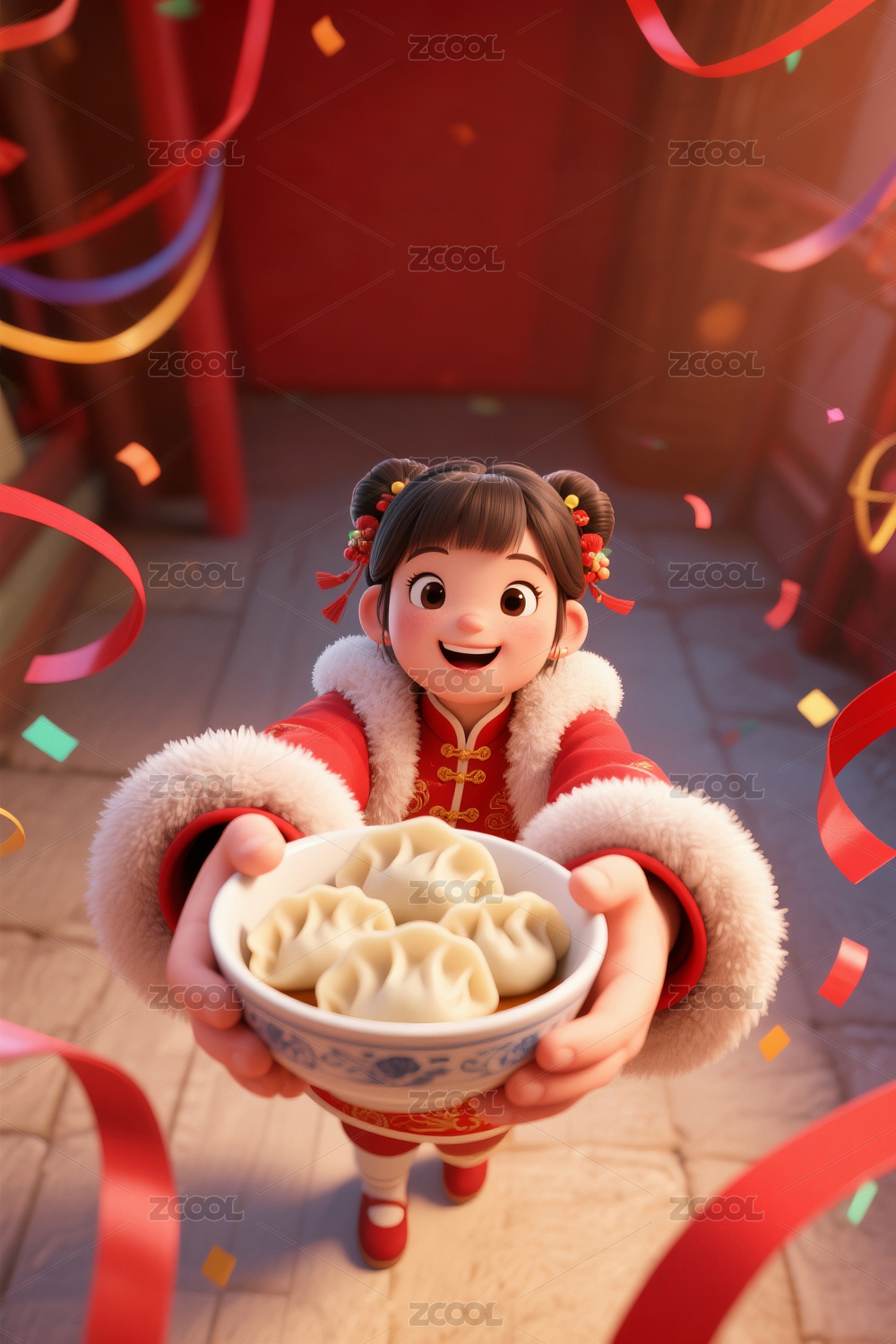 3d卡通插画手捧饺子的红衣女孩庆团圆