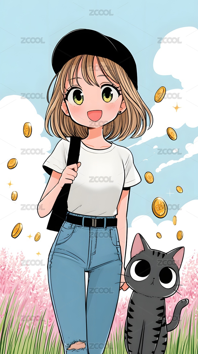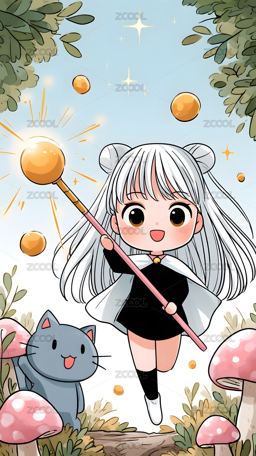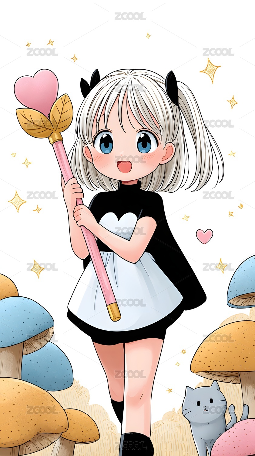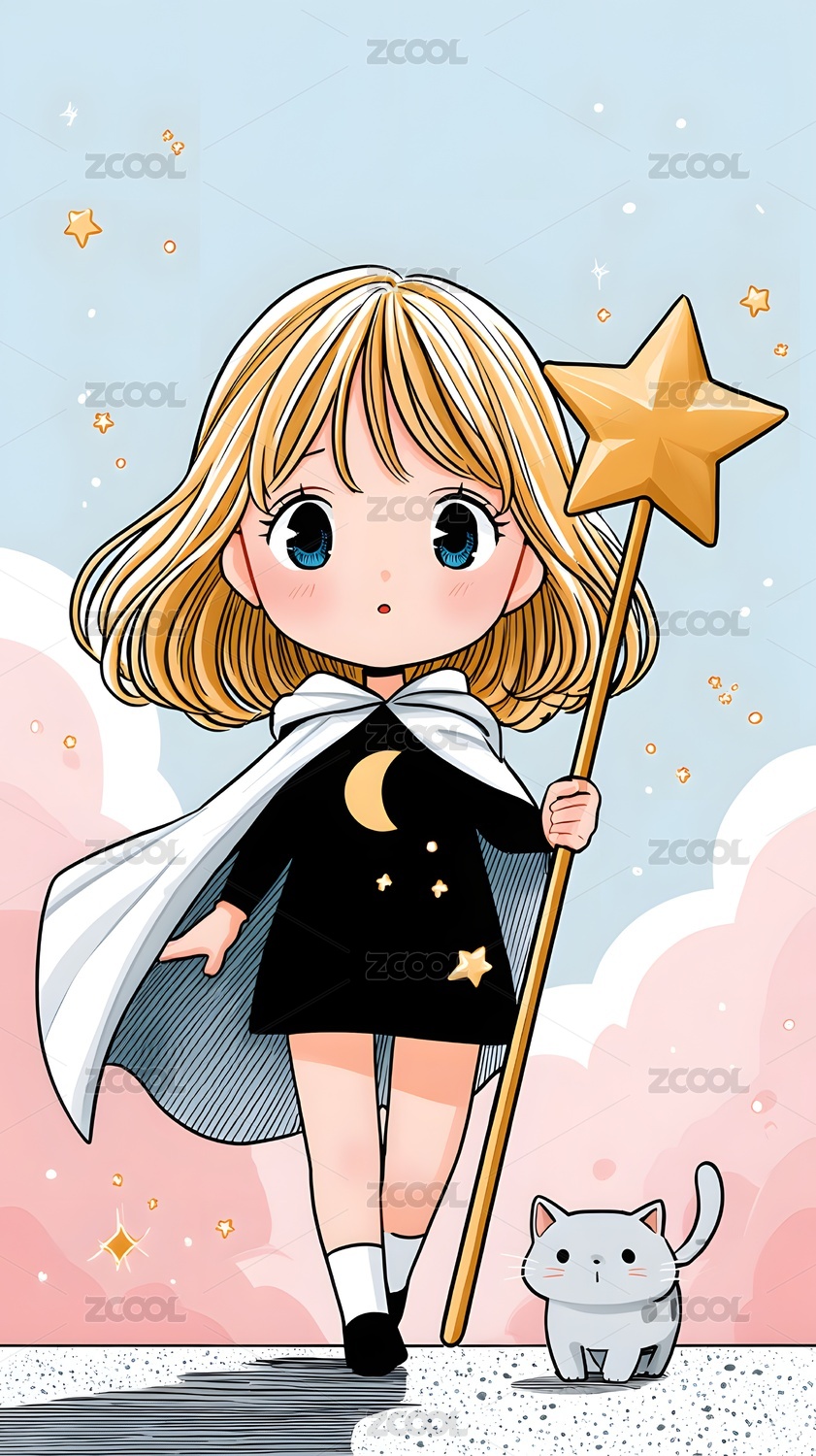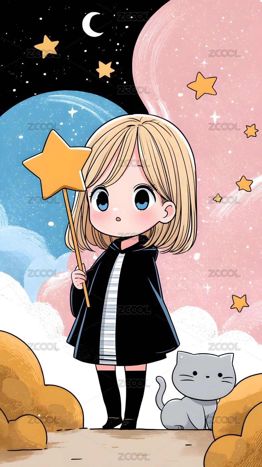 卡通,女孩,星星,黑色,光芒,可爱,治愈,童话,梦幻,插画