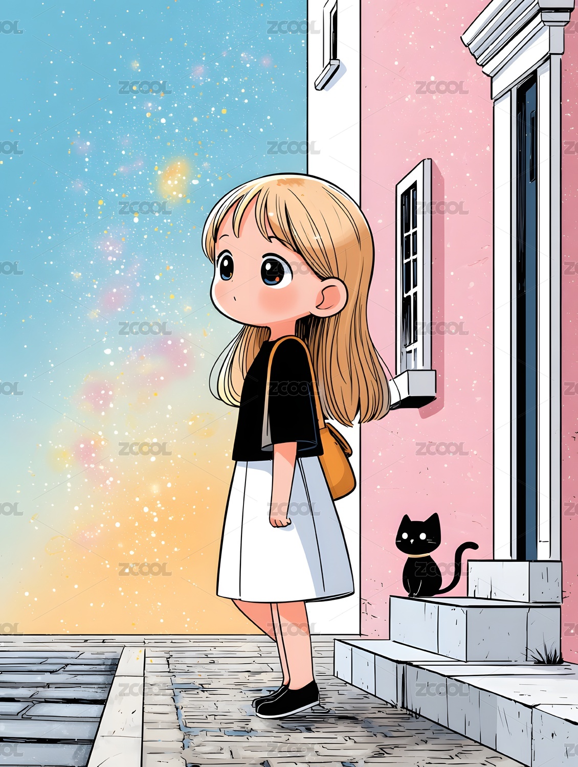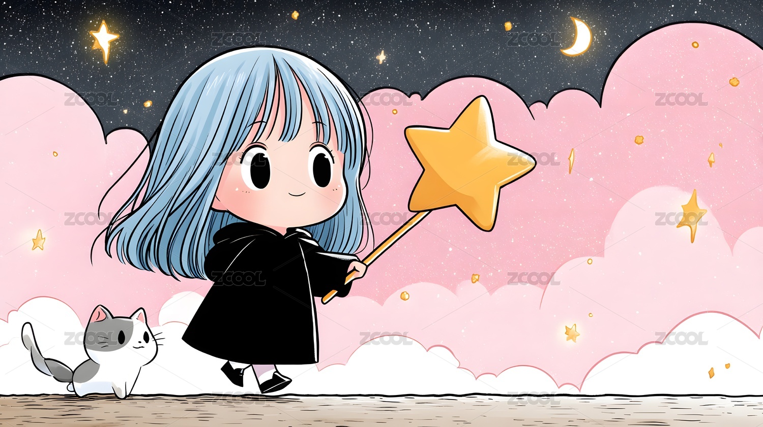可爱,卡通,猫咪,星星,云朵,黑色,白色,天空,夜晚,粉色
