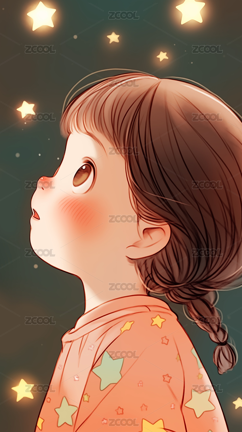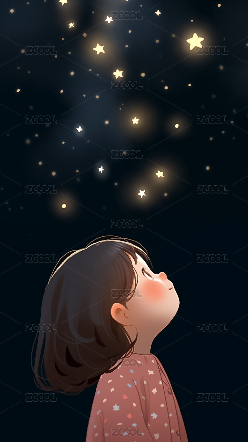 手绘卡通星空下的漂亮的小女孩儿童节插画
