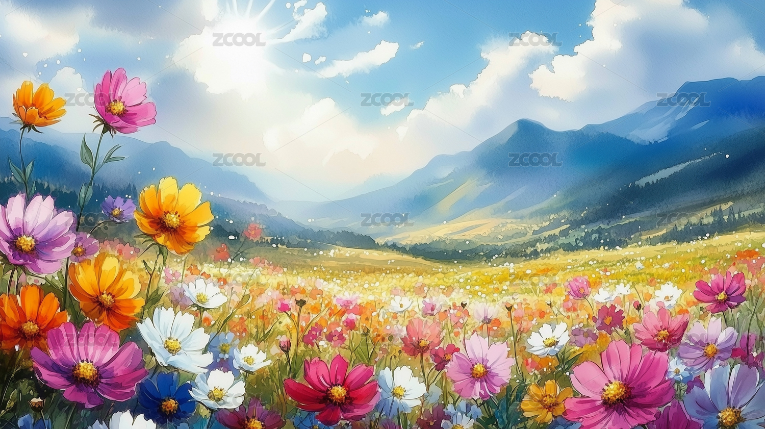 花卉,远山,水彩,自然,绘画,色彩,植物,花瓣,层次,柔和