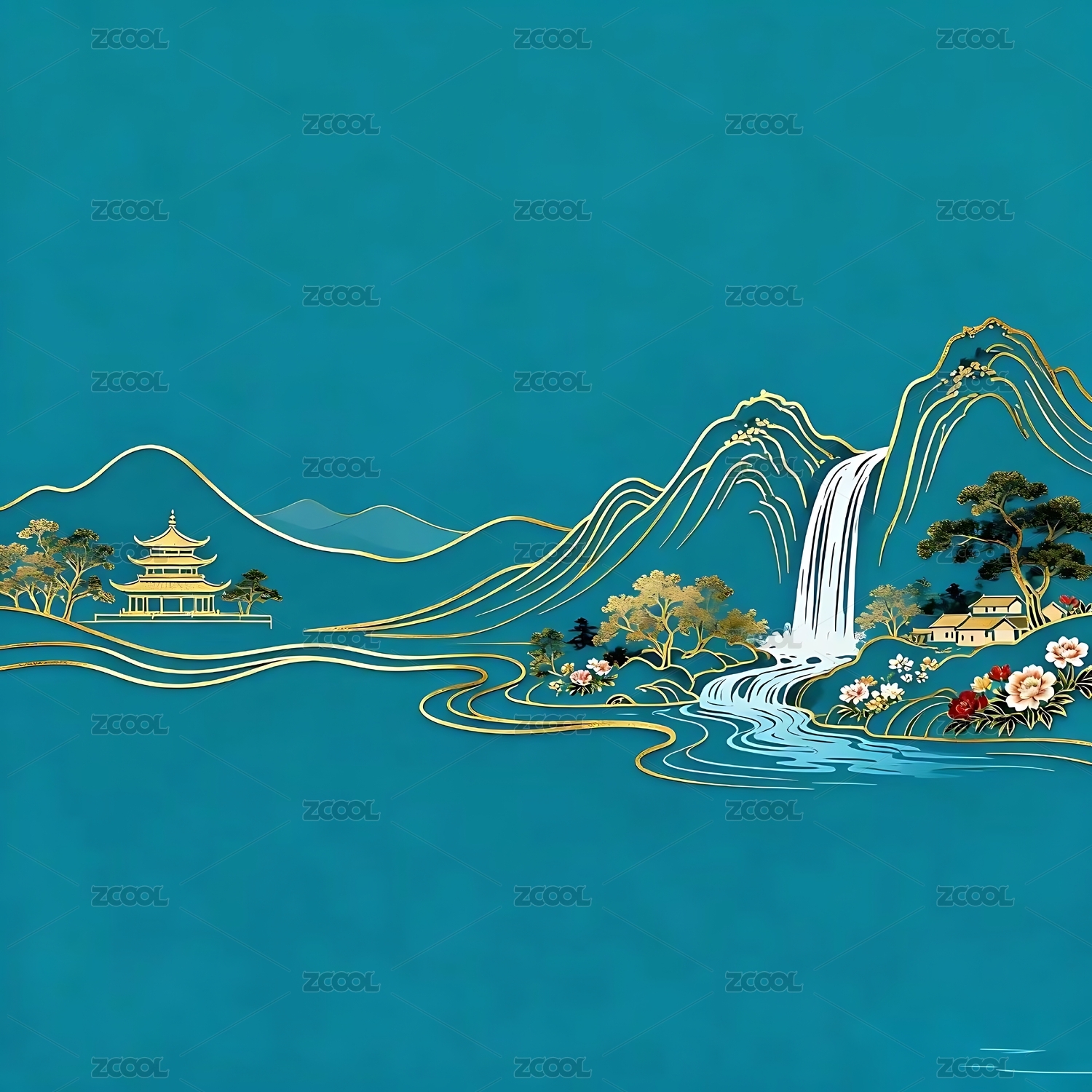 瀑布,山水,楼阁,中国风,传统,古风,山,水,插画,国潮