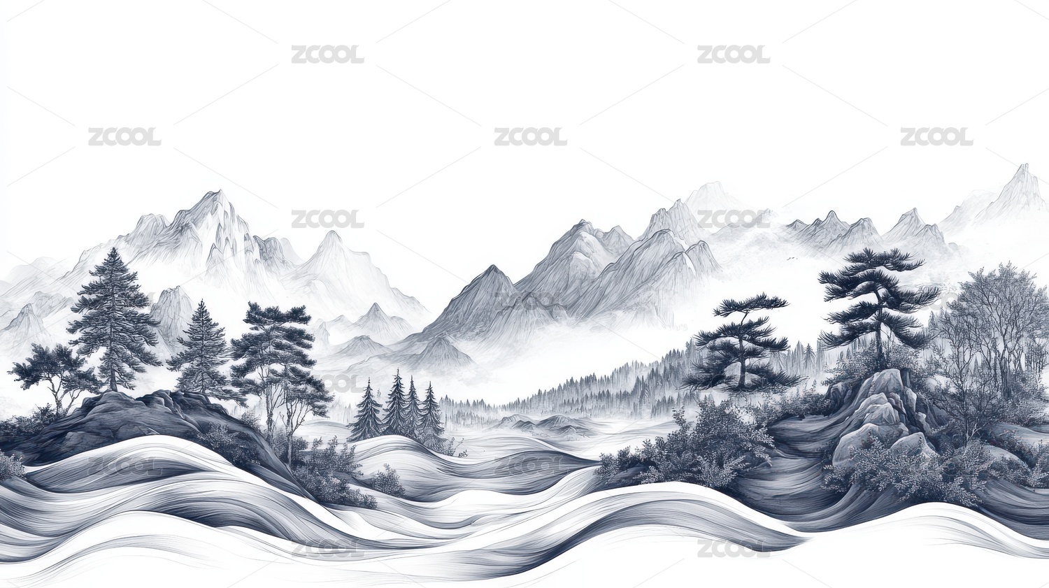 山水,水墨画,意境,中国风,瀑布,古亭,河流,山脉,松树,村庄