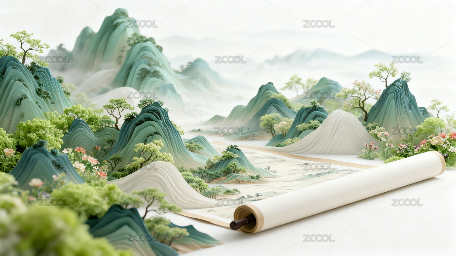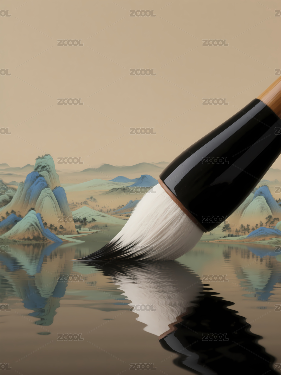 毛笔,山水,水墨画,中国风,古建,亭子,瀑布,意境,传统文化,绘画