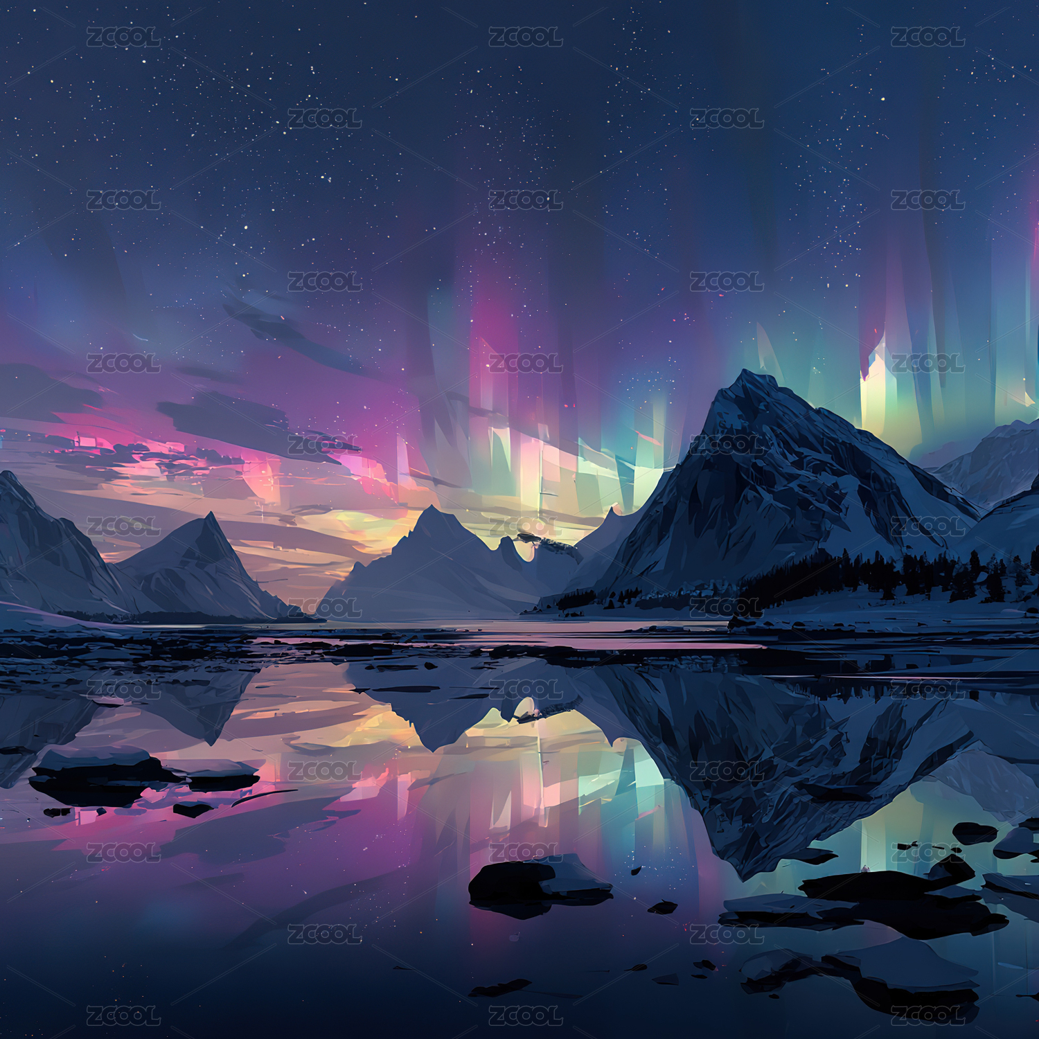 极光下的山湖倒影插画