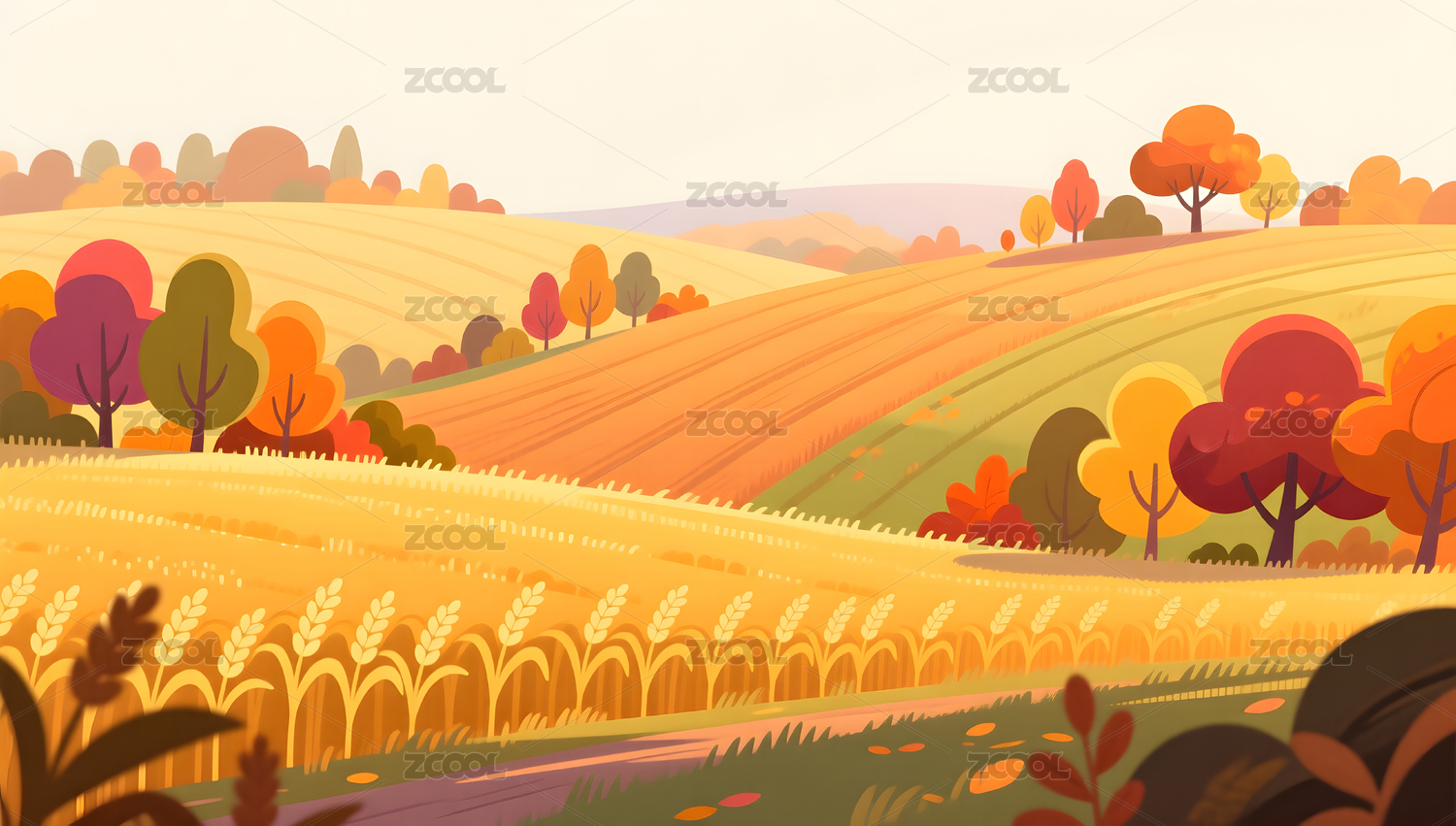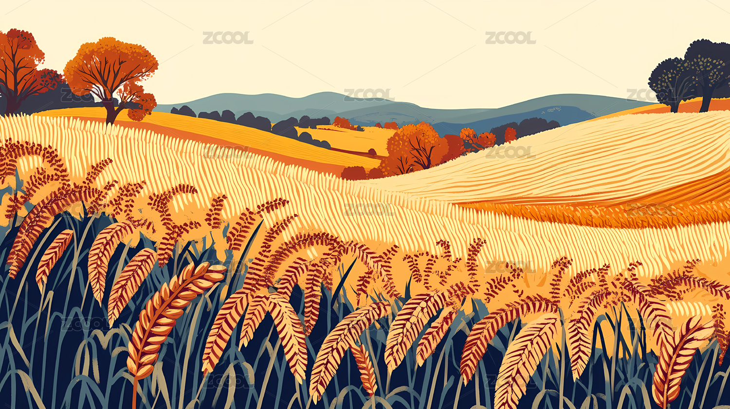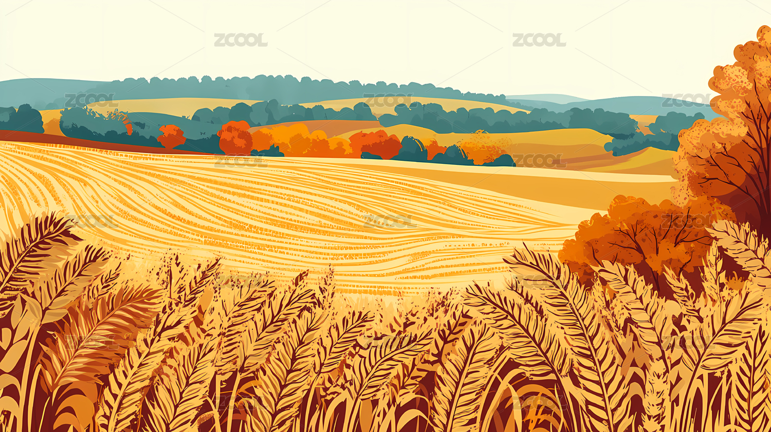 秋天秋季麦田自然风景收麦子卡通漫画插画