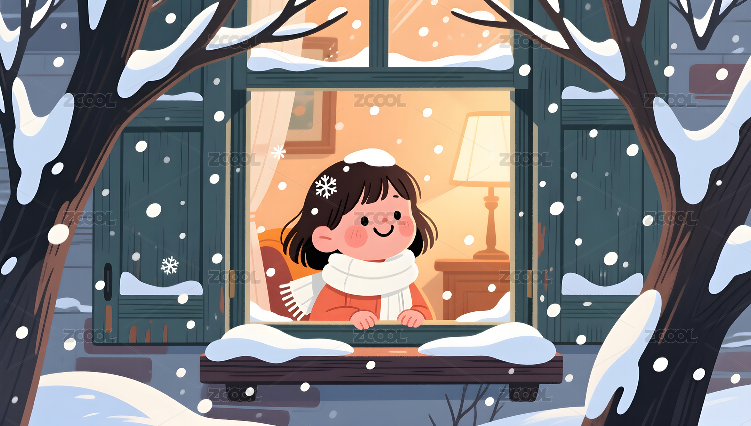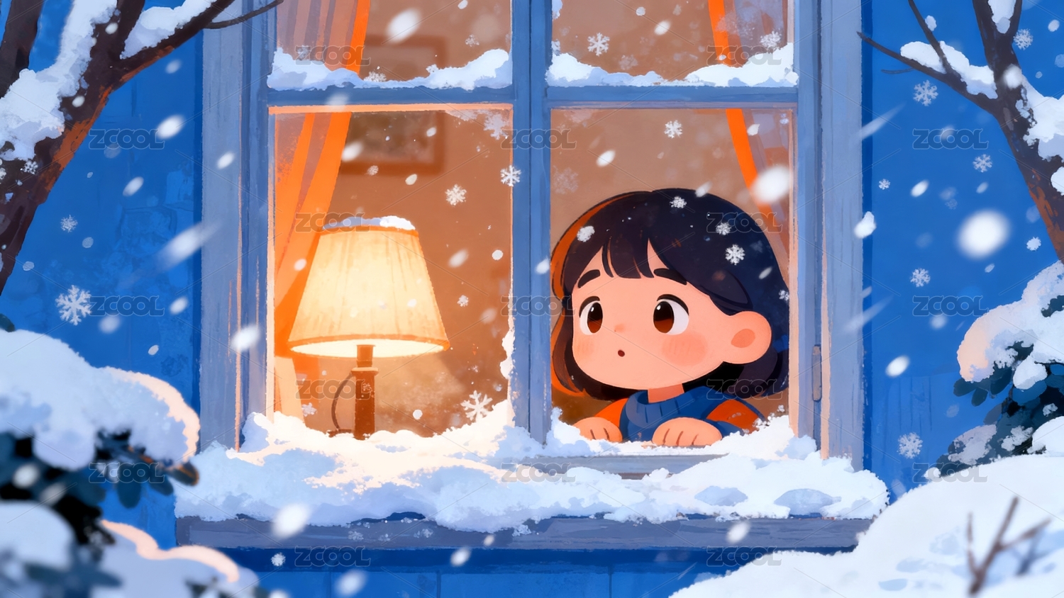 主视觉,商业,壁纸,雪景,女孩,暖调,雪夜,窗边,房屋,灯光