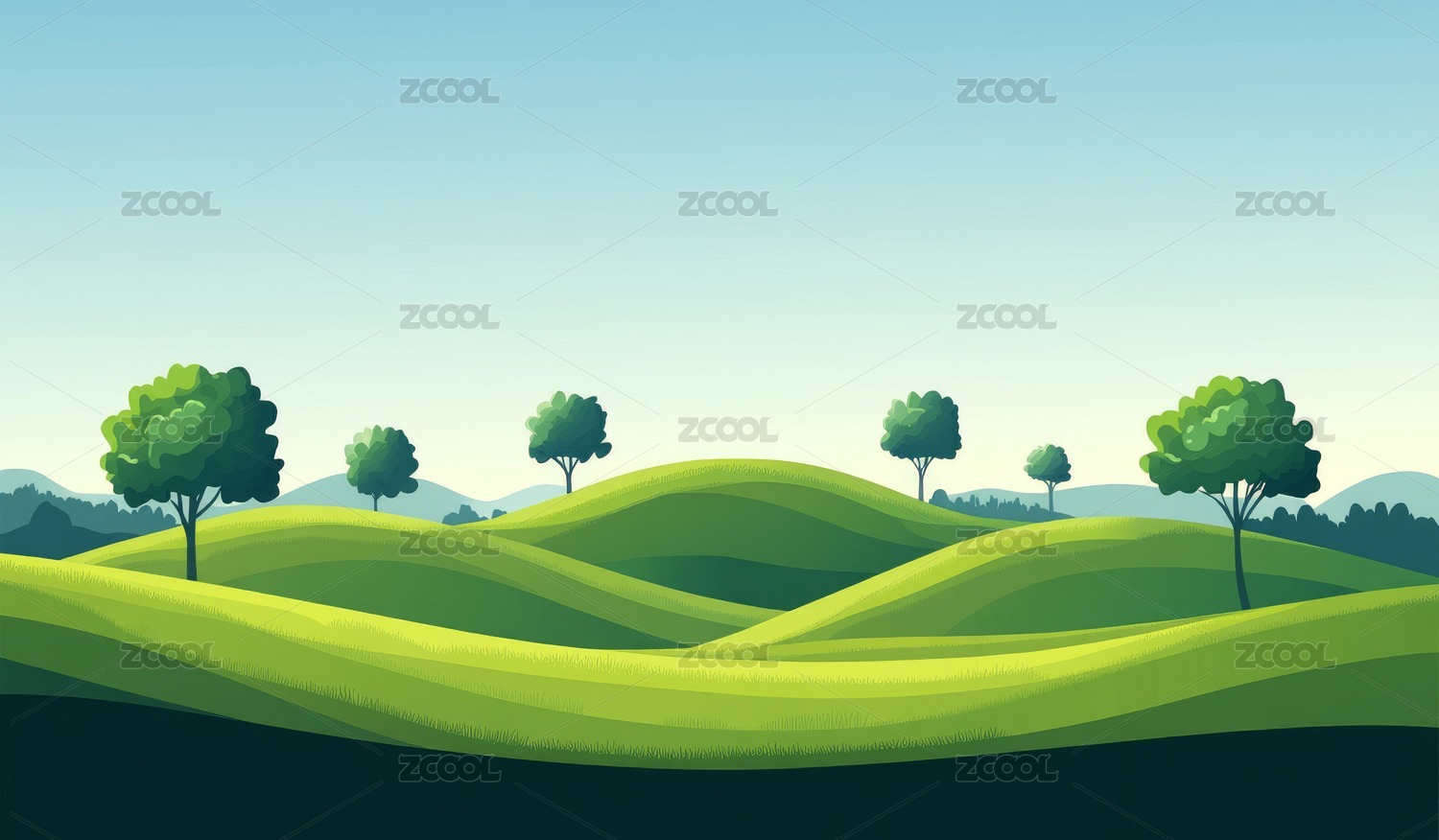 扁平风绿色起伏的山丘上的树风景插画
