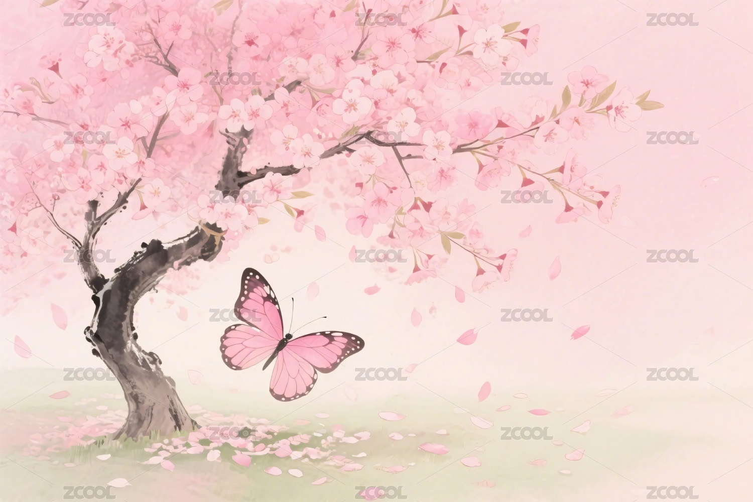 水墨水彩樱花中国风樱花桃花插画装饰画