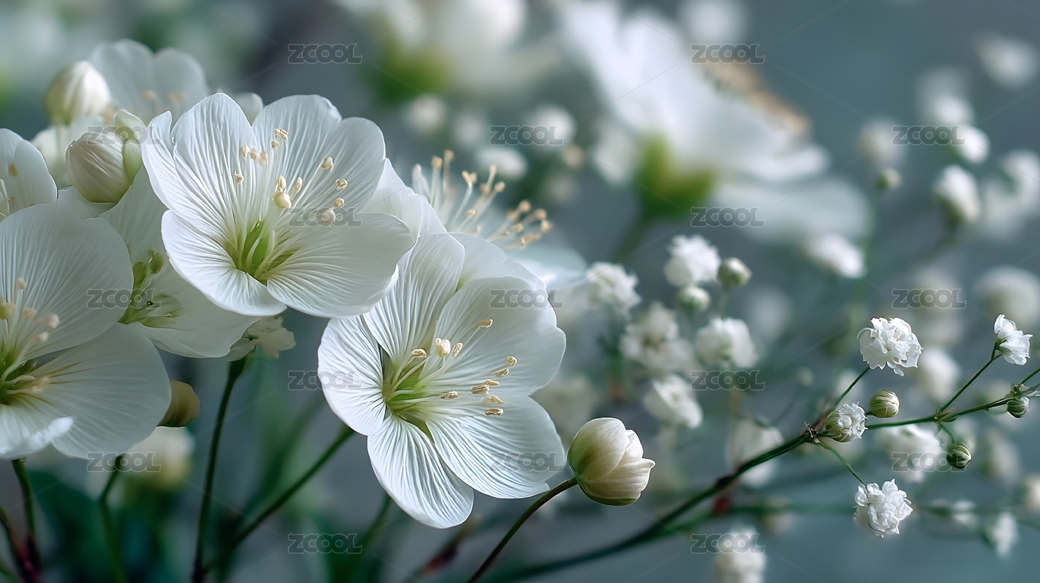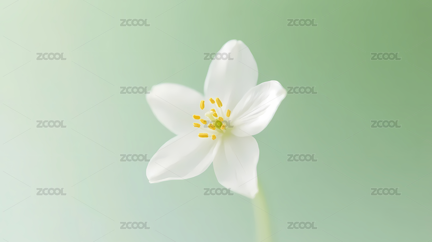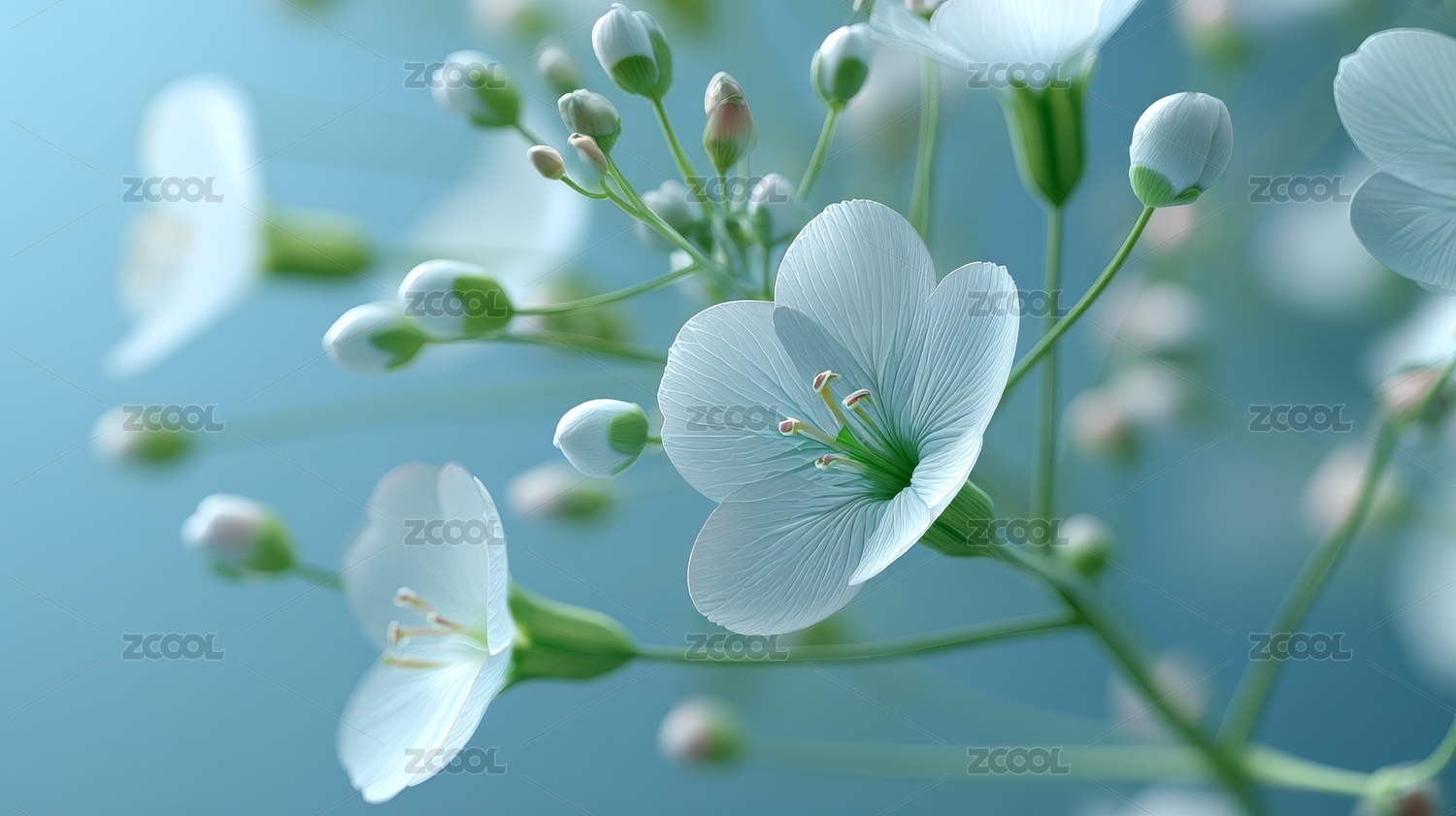 白色小花特写:嫩绿花茎衬托纯洁花瓣