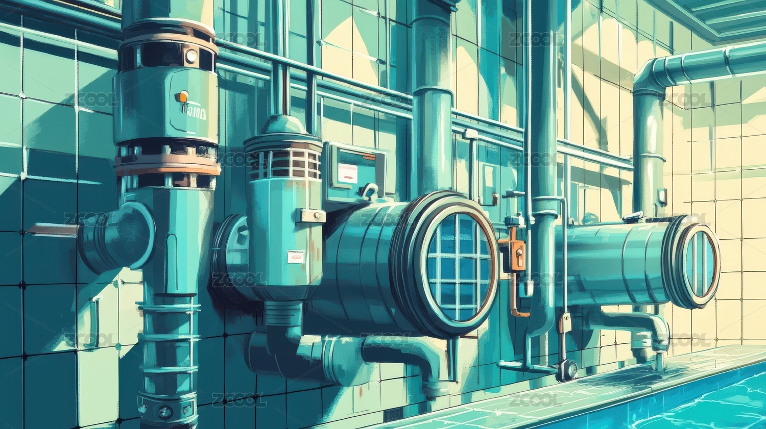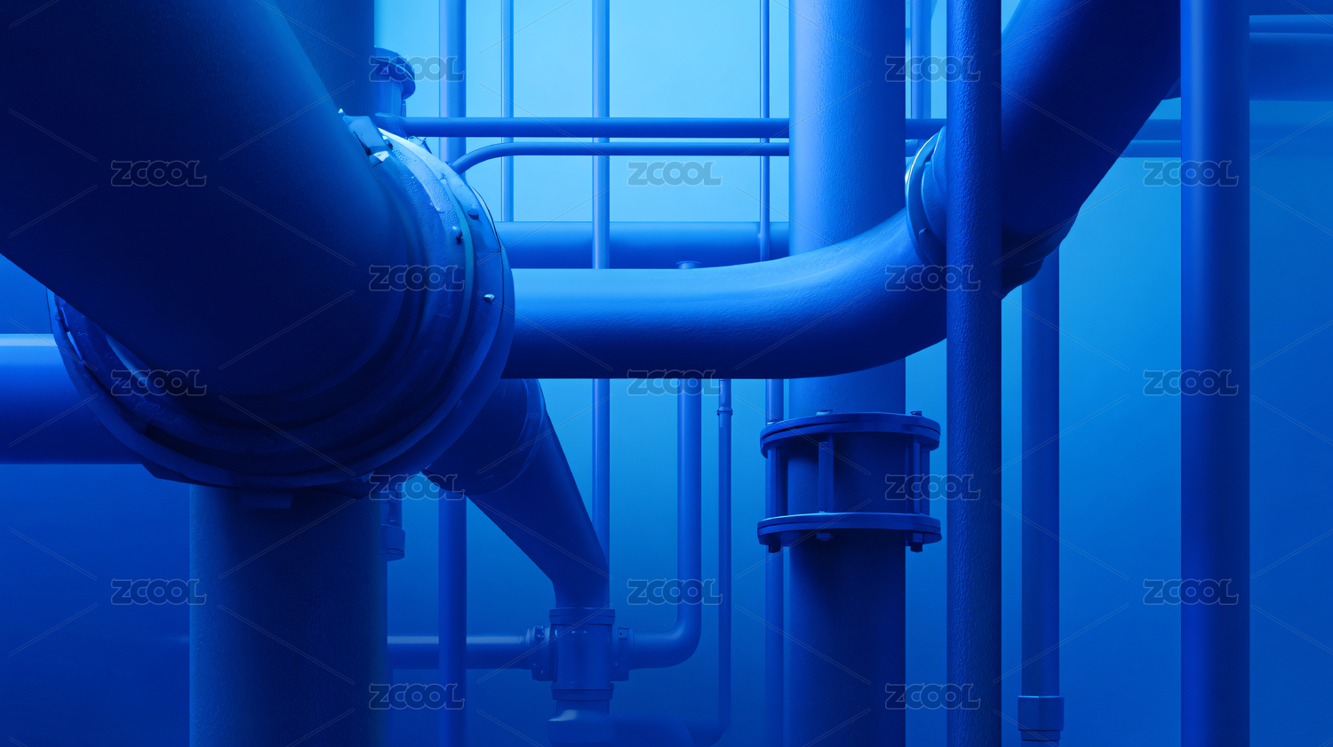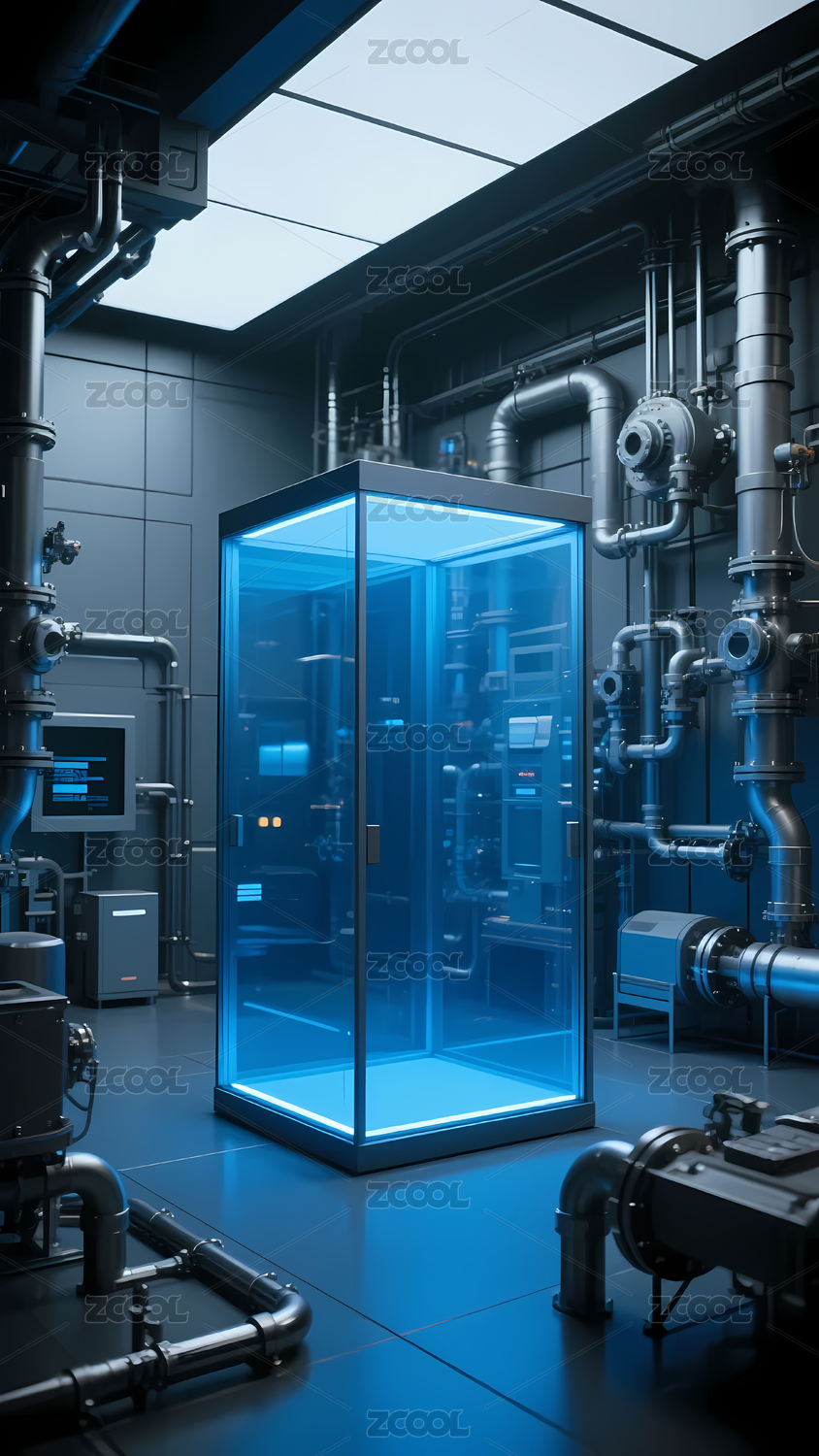 蓝色,银色,管道,阀门,控制箱,墙壁,室内,灯光,工业,设备