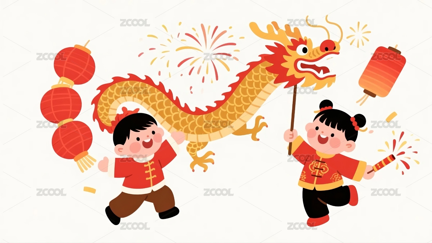 卡通女孩舞龙庆祝节日
