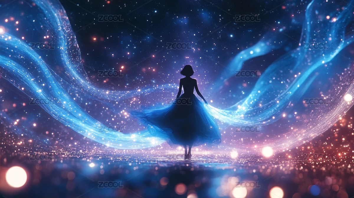 剪影,女性,星光,梦幻,宇宙,粒子,光线,魔法,优雅,礼服