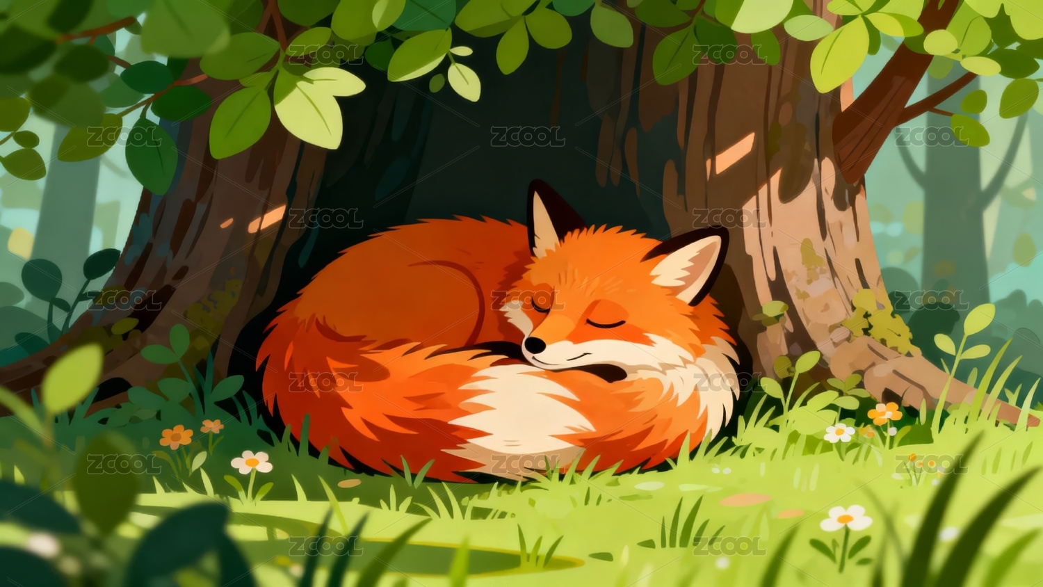 睡觉,耳朵,尾巴,卡通,休息,宁静,插画,植物,场景,狐狸