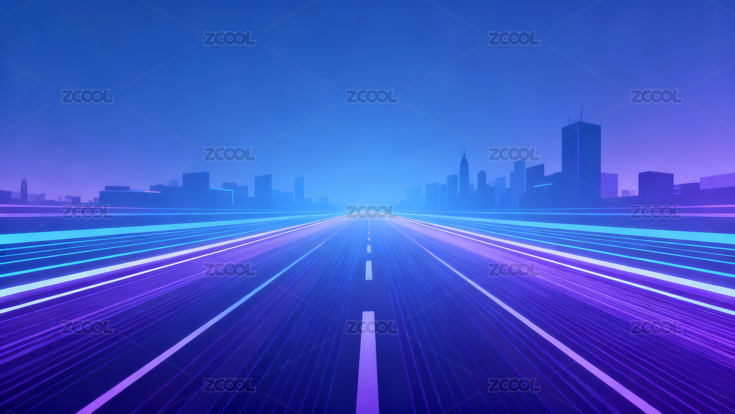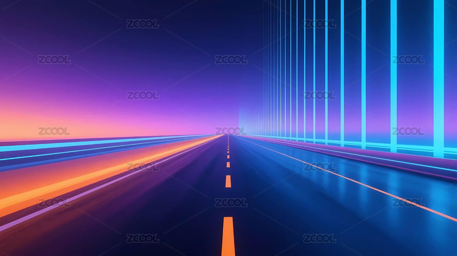 夜晚抽象荧光色城市建筑的马路3D立体插画