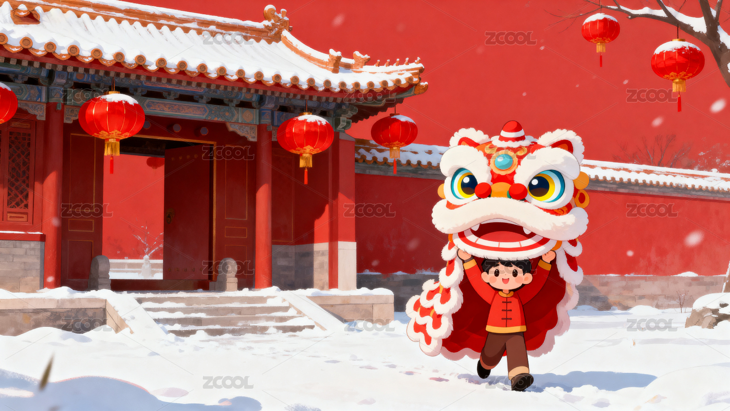 舞狮庆祝新年红墙雪景