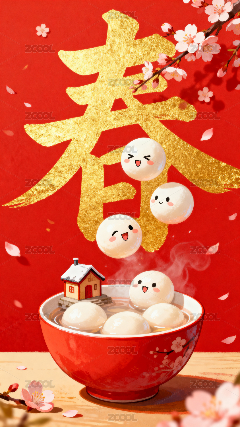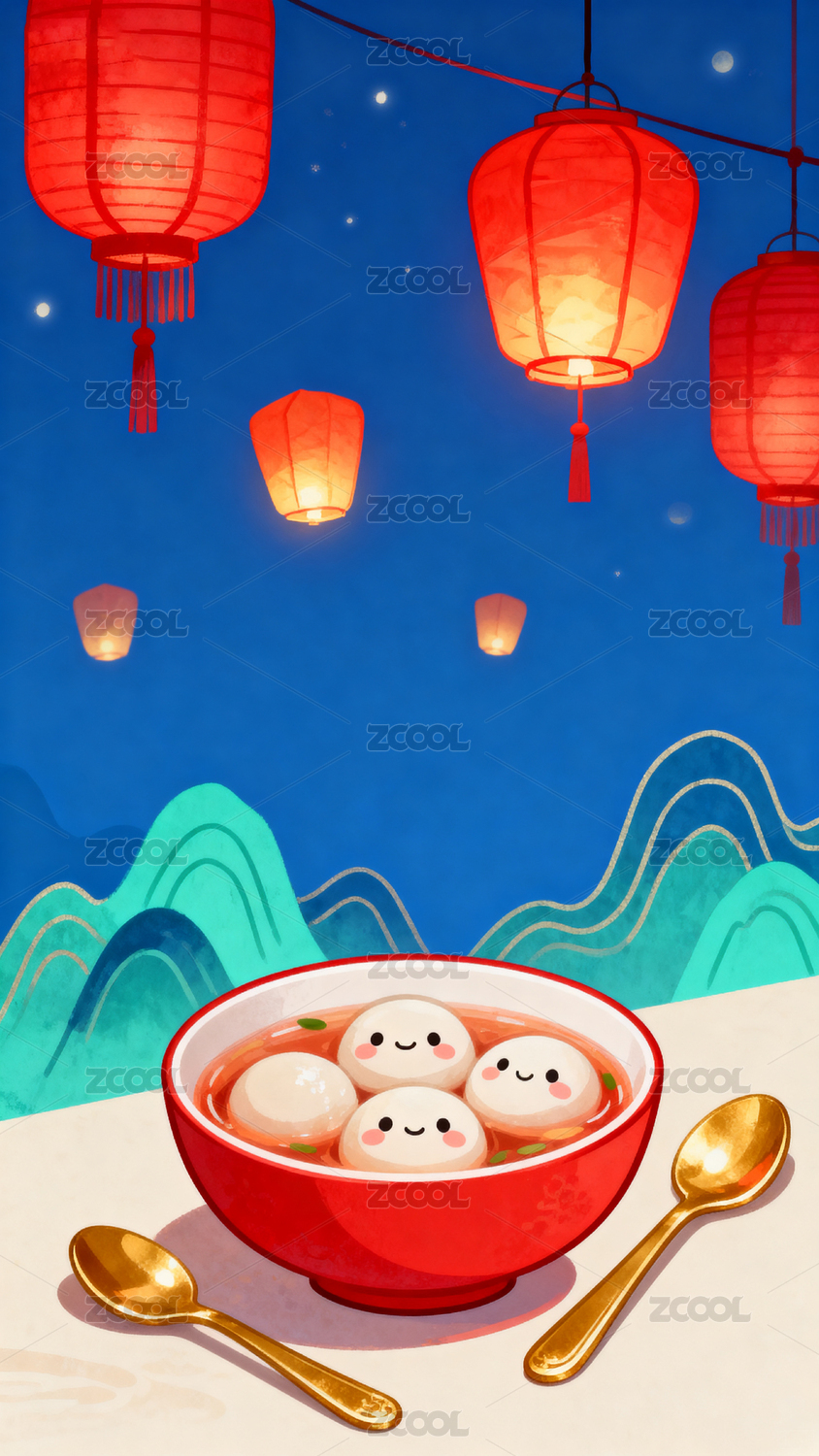 元宵佳节一碗汤圆和灯笼猜灯谜等国潮风插画
