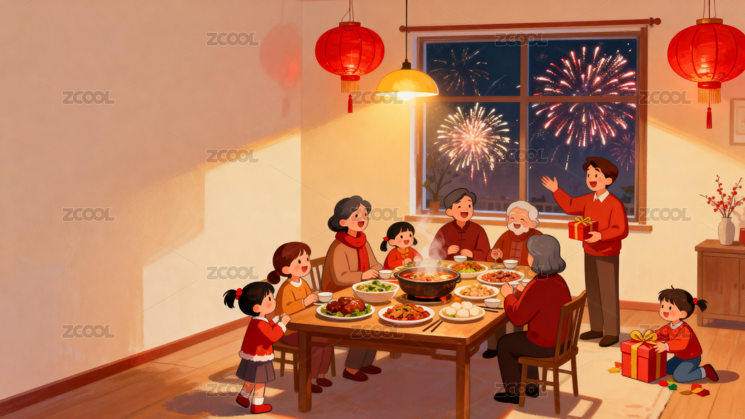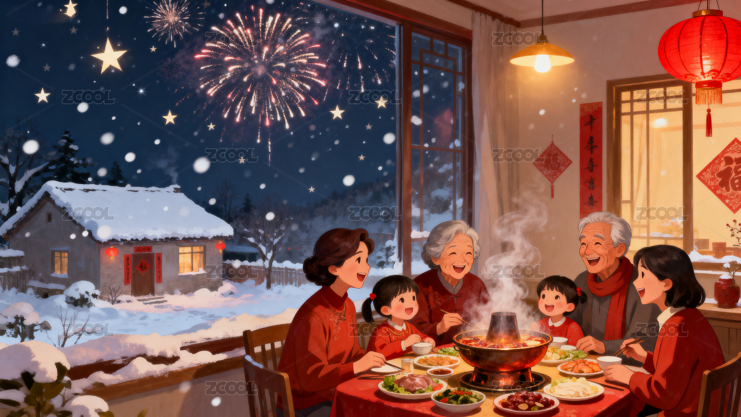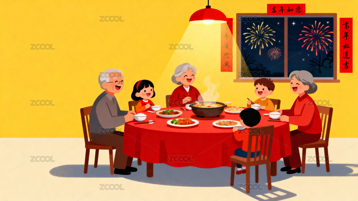 除夕,年夜饭,新年,春节,团圆,老人,青年,孩子,老少同堂,笑